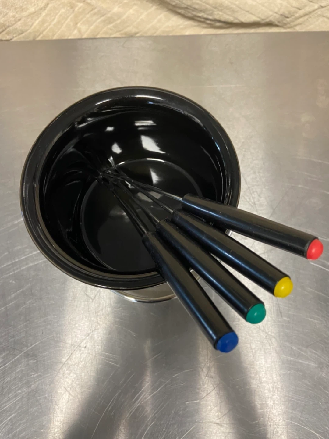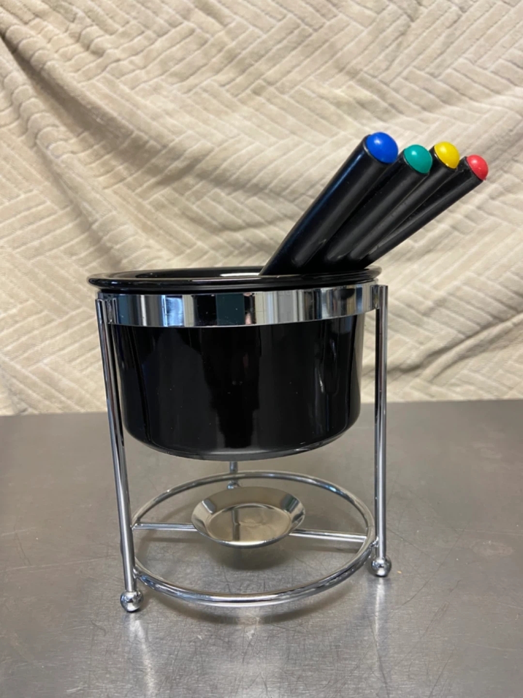 2 Ceramic Fondue Sets: Chocolate and Cheese/Broth sets including 4 and 6 forks. Black Ceramic Pots and Stainless Steel Frames. Forks have coloured tips. Great for melting cheese or chocolate!