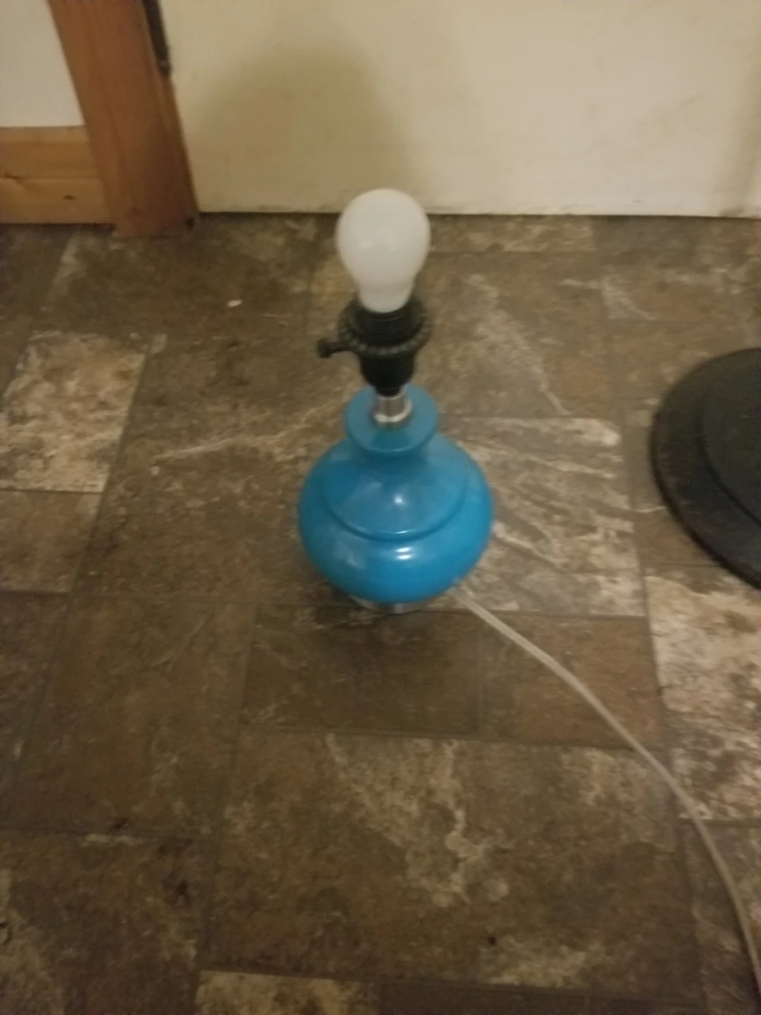 A small blue table lamp with a white light bulb included. It's a ceramic base and has a power cord. This lamp is ready for use in any room! Without lamp shade. My pup got to it a few months ago. Js want it gone