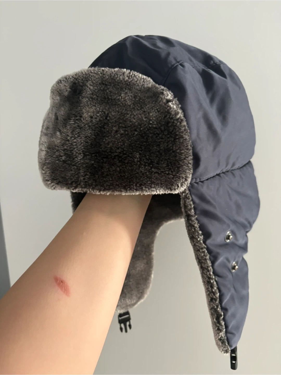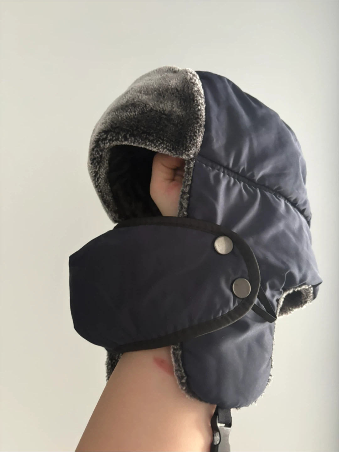 This navy blue trapper hat is designed for cold weather. It features a soft faux fur trim around the ear flaps and neck for extra warmth. The hat has a buckle closure for a secure fit. It's great for staying cozy during chilly days!