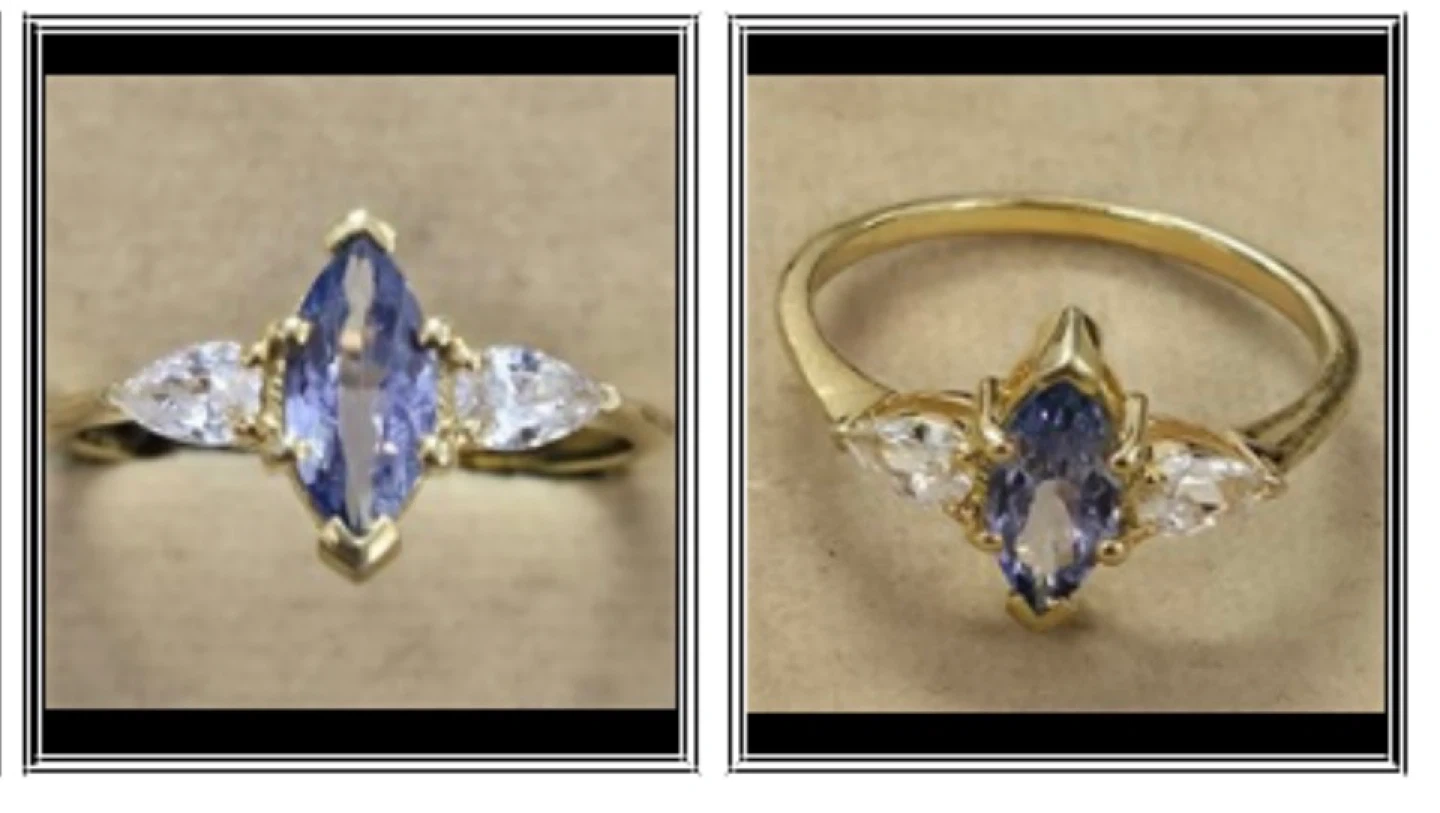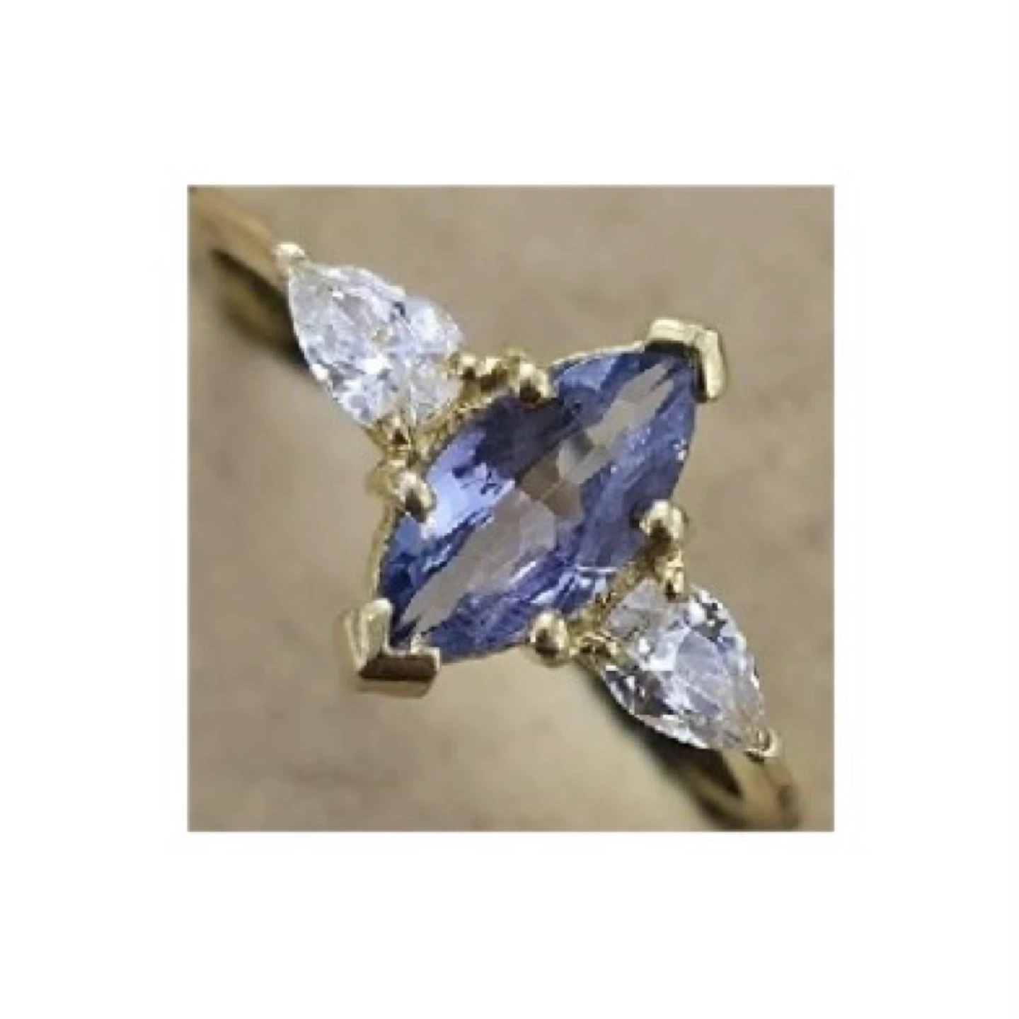 This ring is crafted from gold-rhodium plated sterling silver and features a marquise-cut tanzanite with white topaz accents (1.55ct). It weighs approximately 4.35g. #528