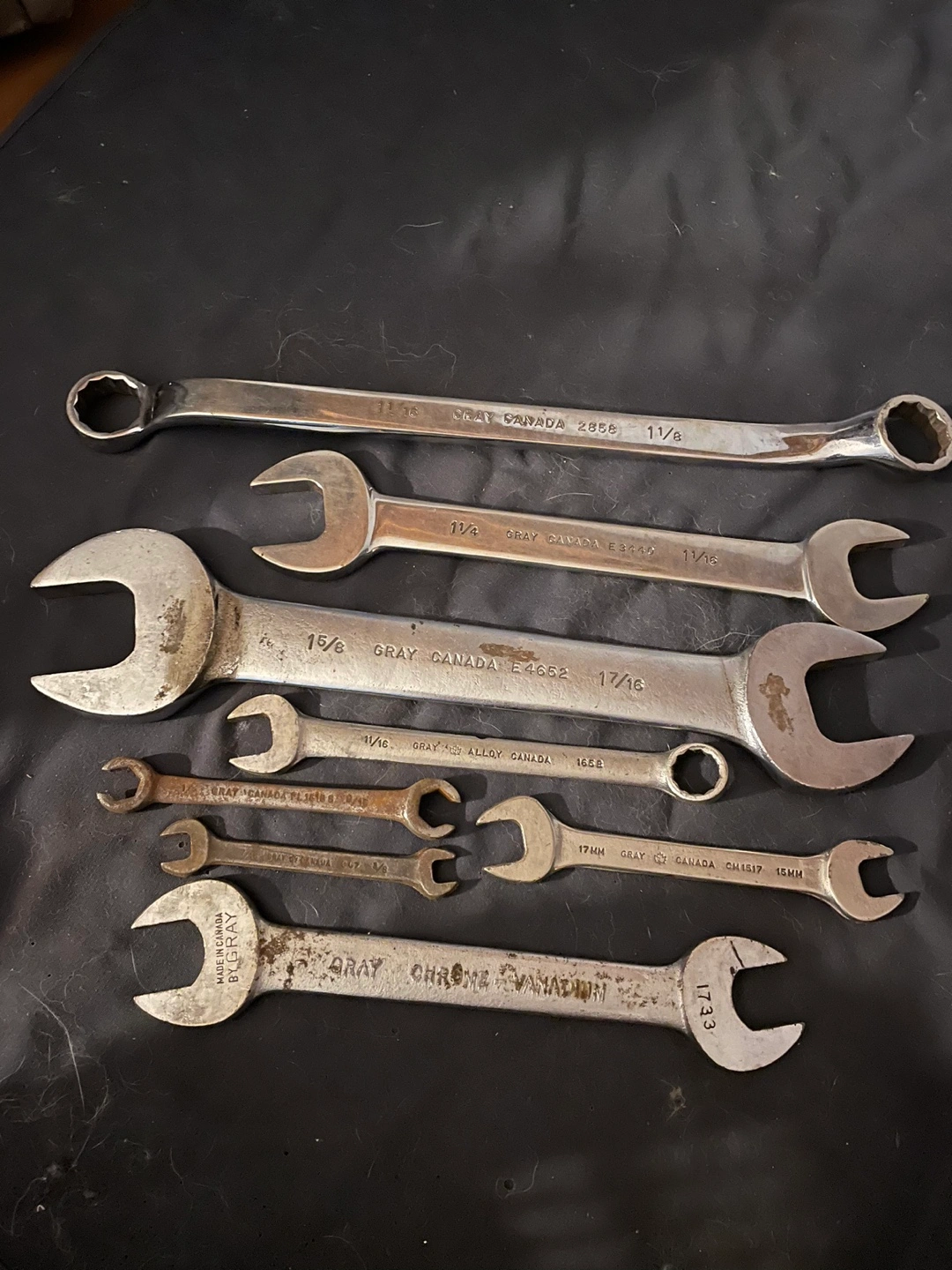 Set of 8 wrenches, including a 11/8, 11/4, 11/16, 15/8, 17/16, 11/16, 7/8 and 17mm. All are in good condition. Brand is Gray- proudly MADE IN CANADA!
