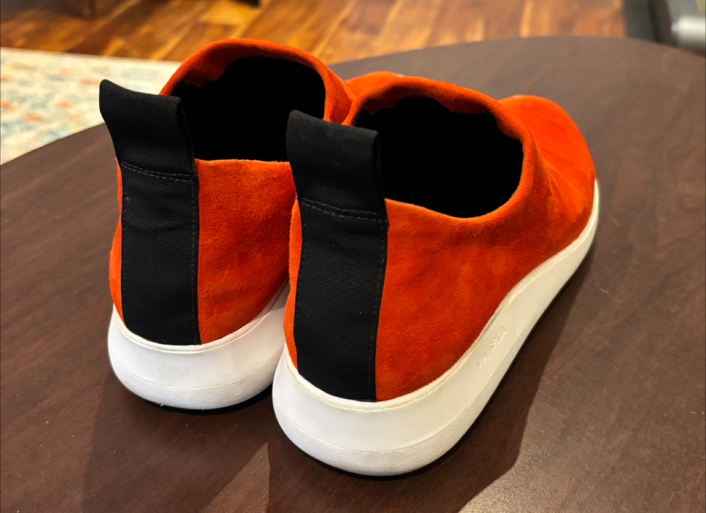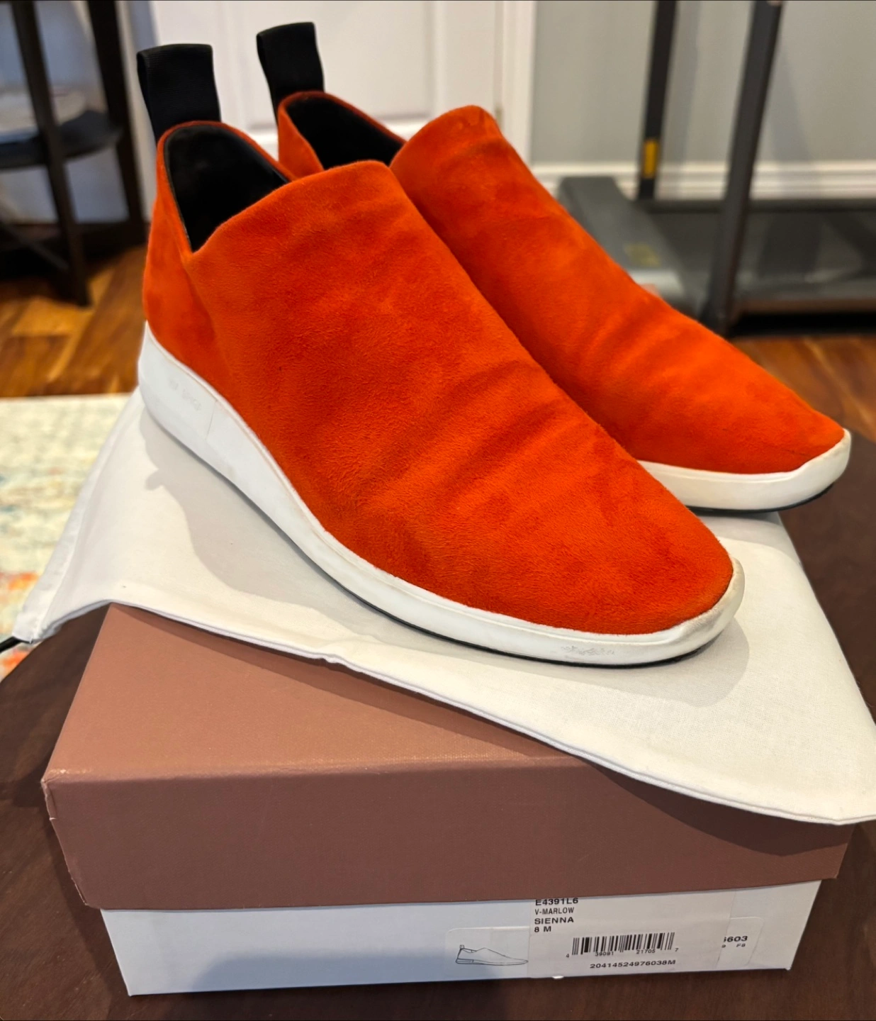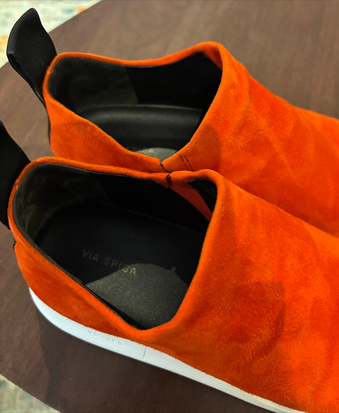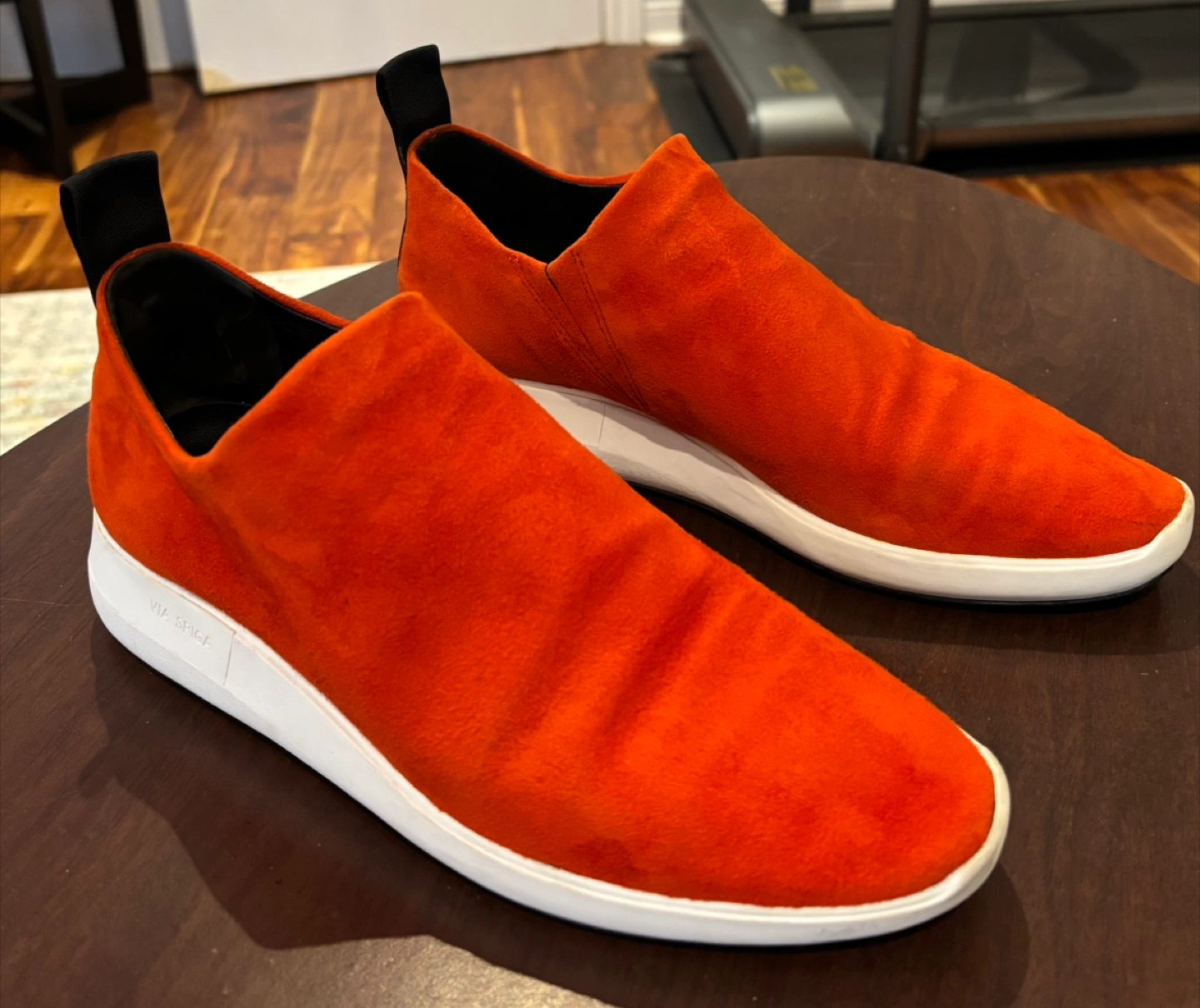 Via Spiga Marlow suede slip on shoe/sneaker size 8M. Stretch at the opening and pull on tab for ease to put on. Comfy with treads at bottom to avoid slipping. The colour is ‘sienna’ which in person is like an orangey/red. Worn only a couple of times.