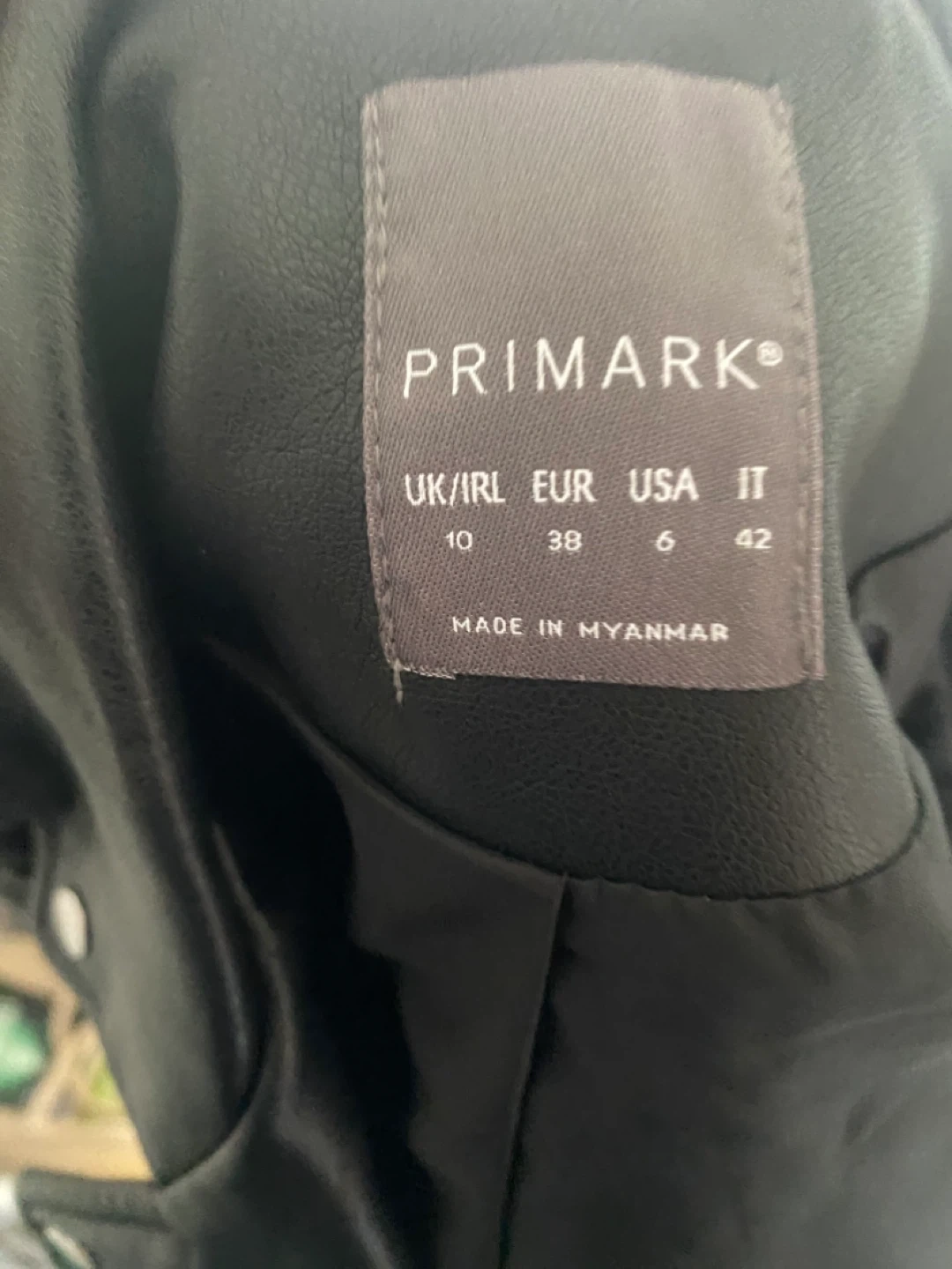 This is a black faux leather biker jacket from Primark UK. It features a zip-up front and multiple zip pockets. Size is US 6 / UK 10