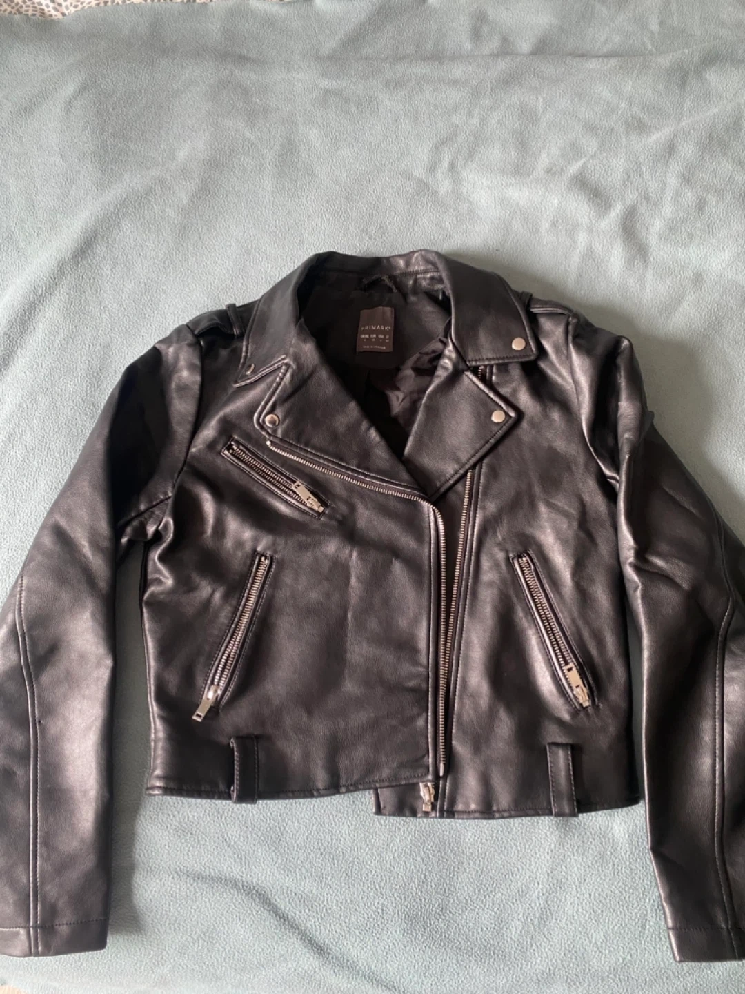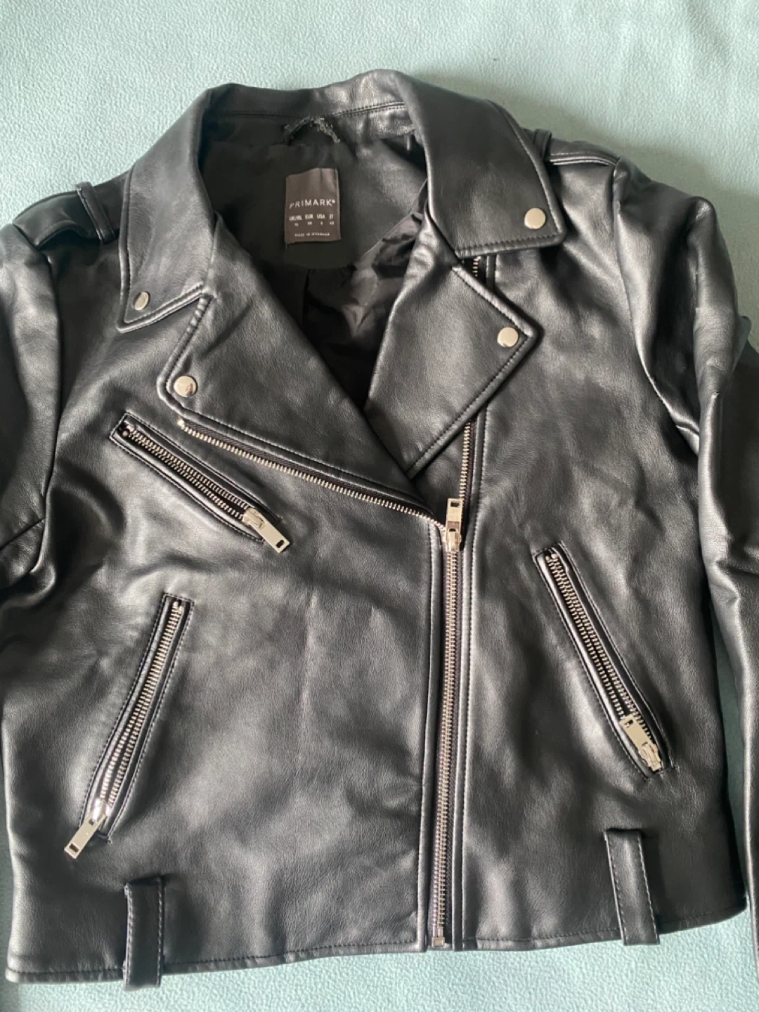This is a black faux leather biker jacket from Primark UK. It features a zip-up front and multiple zip pockets. Size is US 6 / UK 10