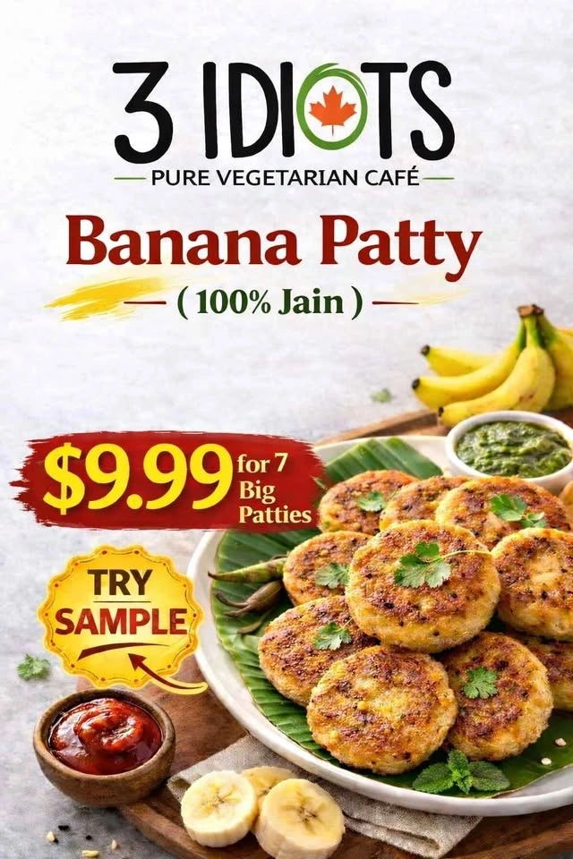 Frozen Jain Burger Patty available for pickup. Made inside a pure vegetarian restaurant kitchen. Wholesale price. $10 for 7 pieces. Made from raw bananas, paneer, green pepper, cabbage, and other vegetables and spices. The taste is guaranteed to be one of the best available in the market. Pickup from 3 Idiots Veg Cafe, Brampton. Please call the restaurant number to check availability.