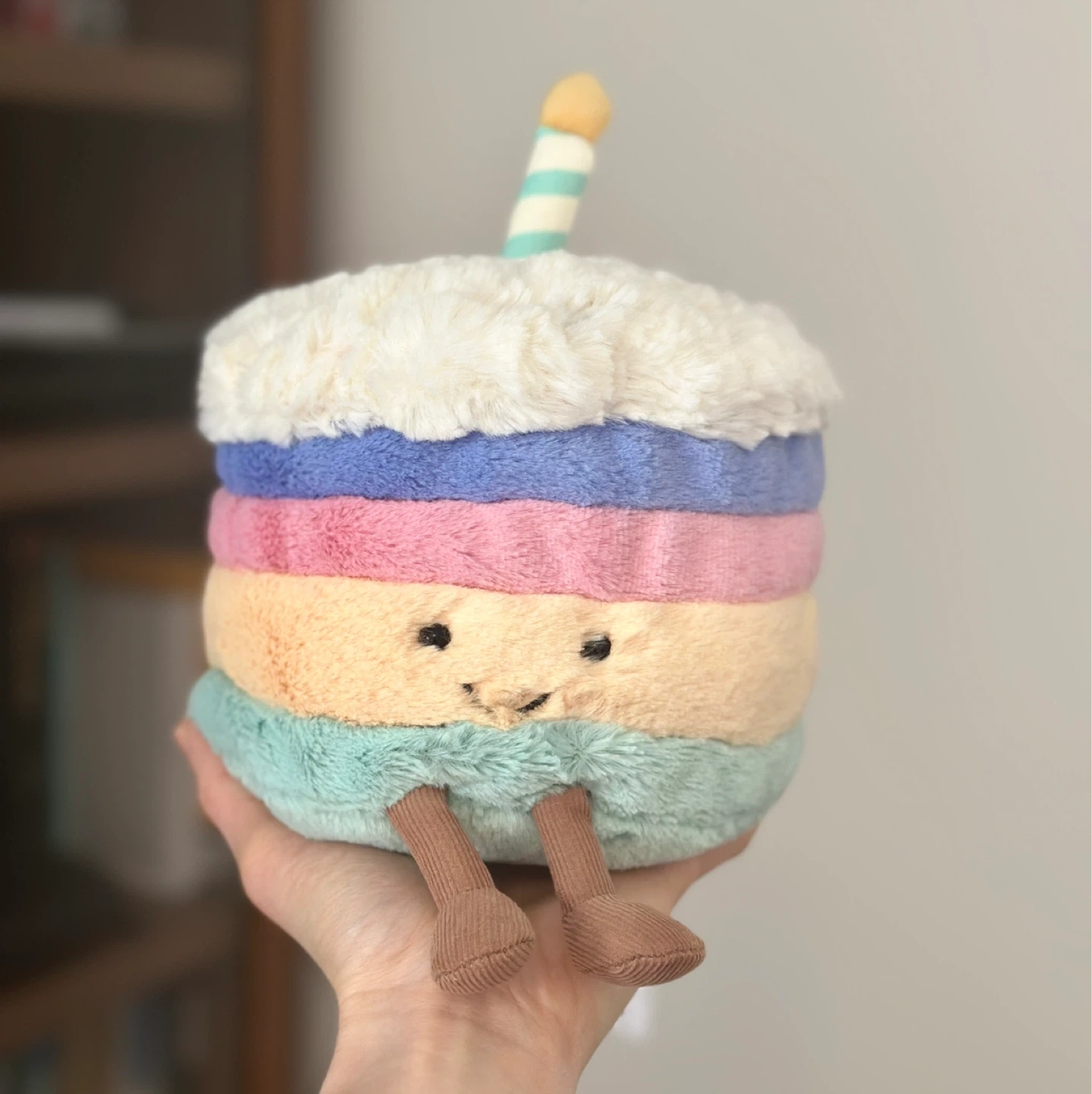 Brand new with tags (BNWT) Jellycat Amuseables Rainbow Birthday Cake. It’s a rare find!