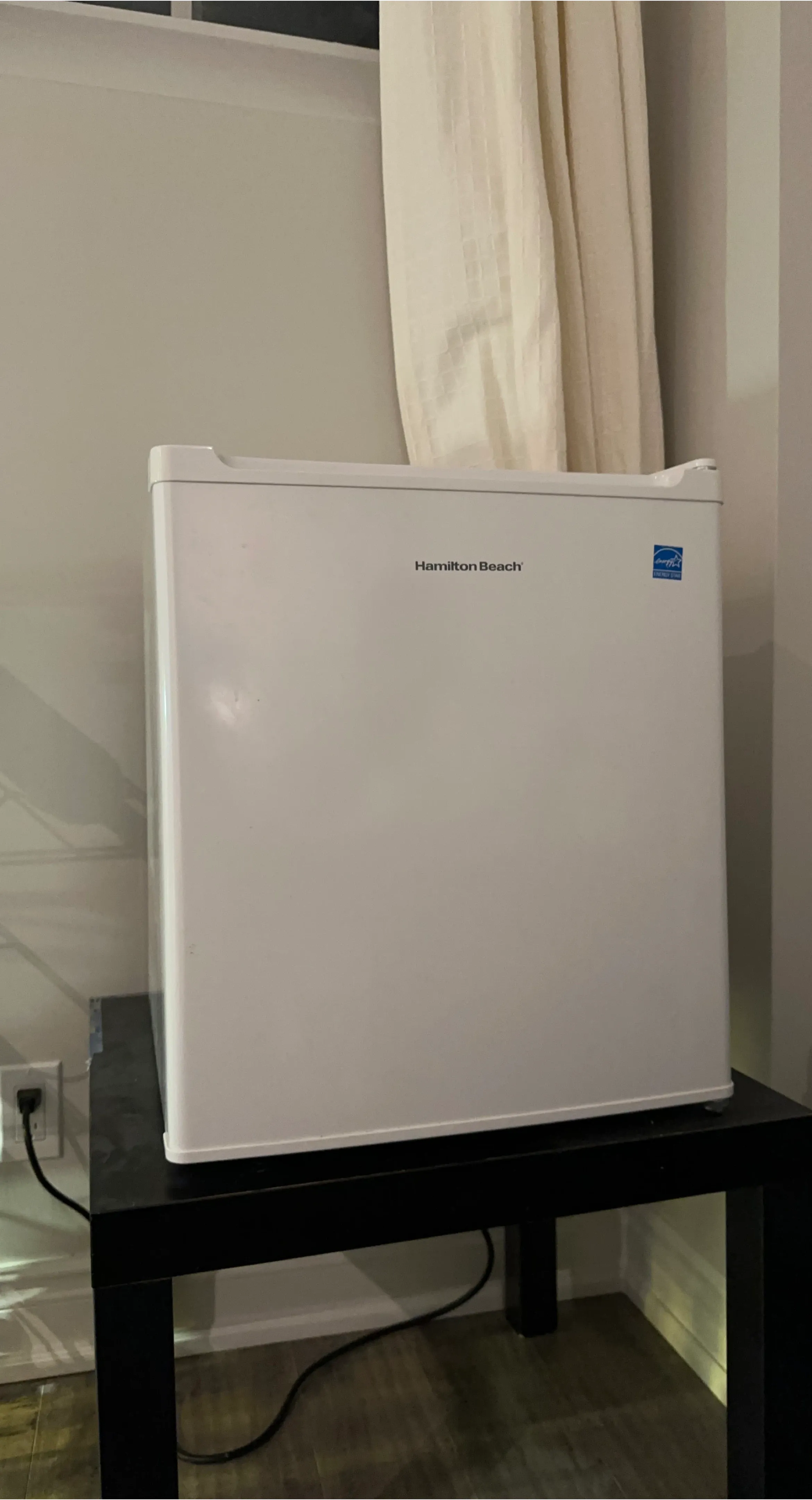 Compact white mini fridge by Hamilton Beach. It's a great size for small spaces. Perfect for keeping drinks or snacks cool!