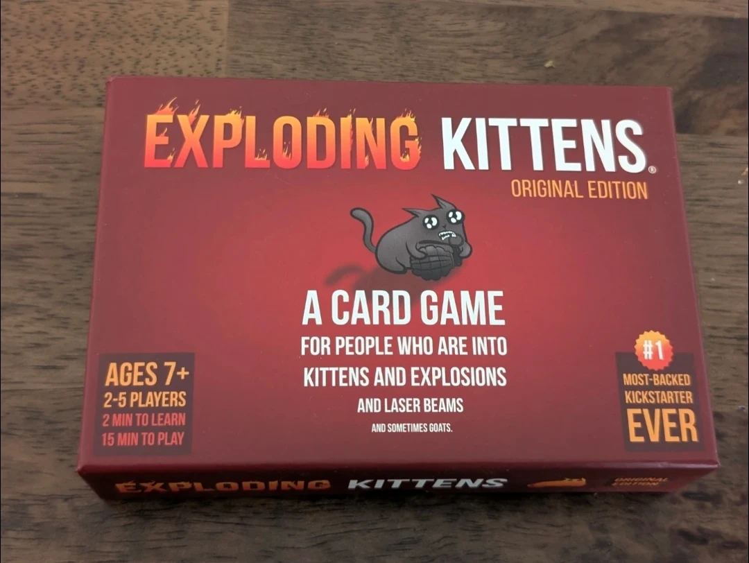 Selling the Exploding Kittens Original Edition card game! It's a fun game for ages 7+, perfect for 2-5 players. Each game takes only about 15 minutes to play, so it's great for a quick and exciting time with friends and family