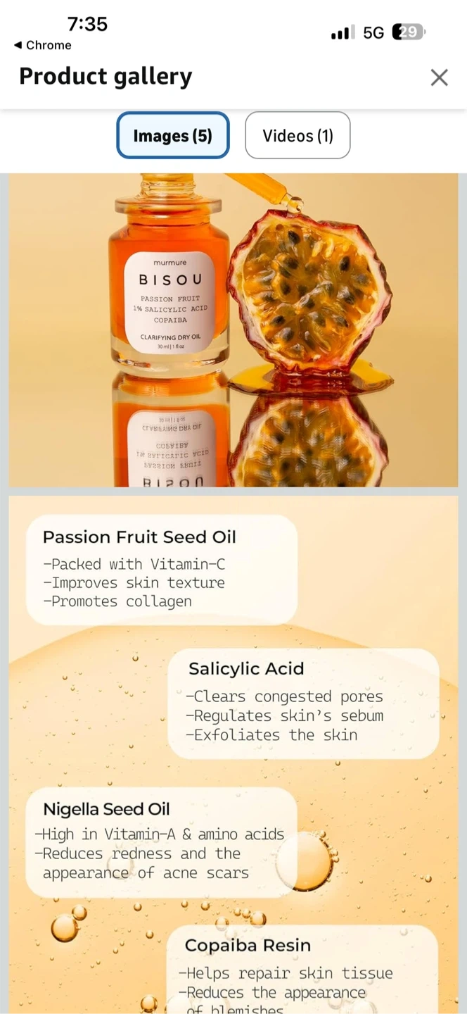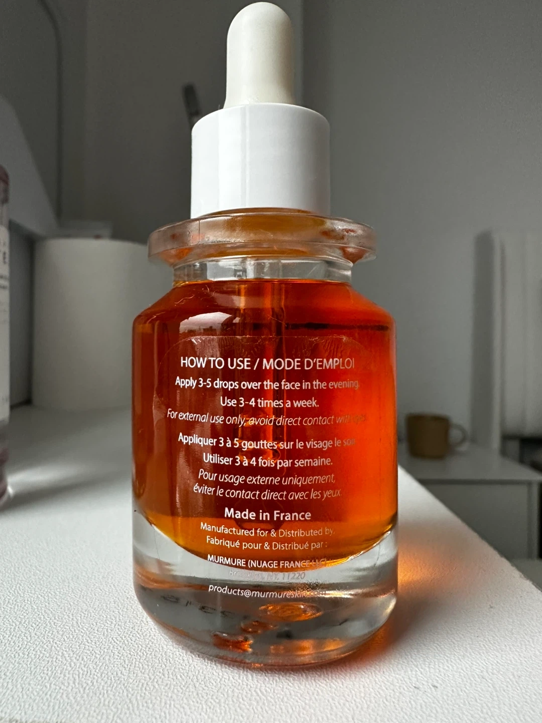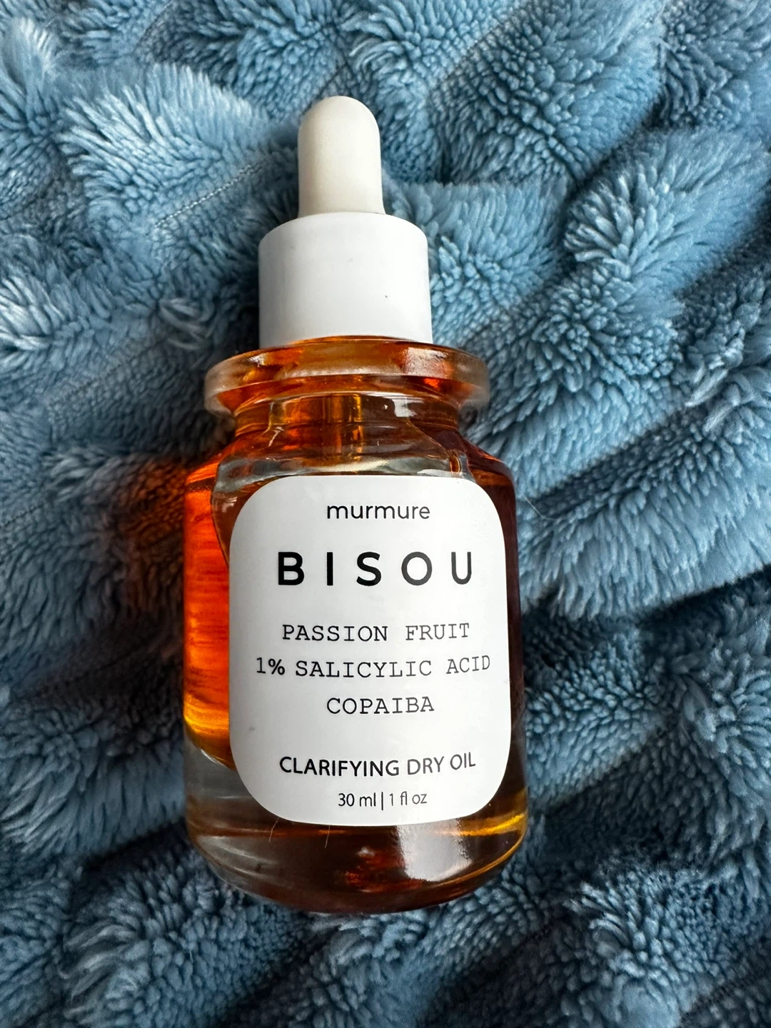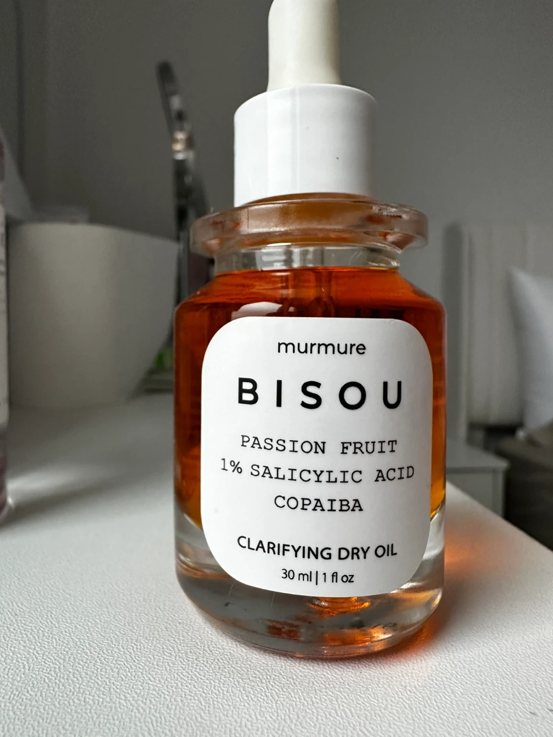 This Murmure Bisou face oil is a clarifying dry oil. It contains 1% salicylic acid and passion fruit. The bottle contains 1 fl oz (30ml).