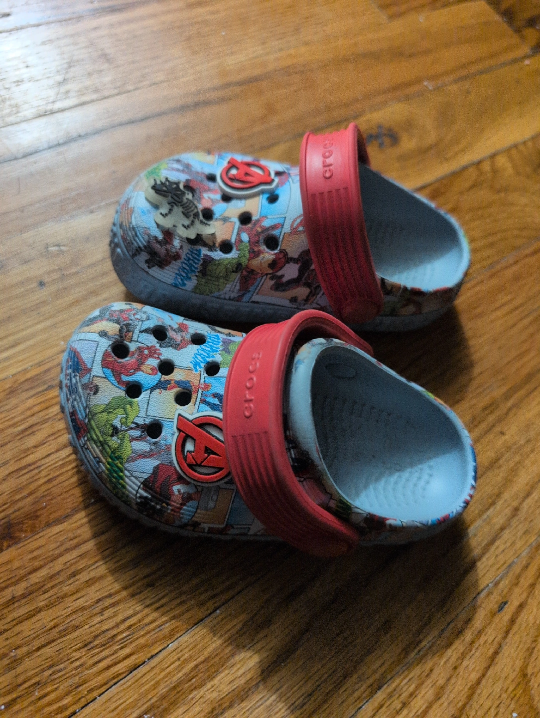 These are a pair of Crocs kids' clogs featuring an Avengers theme! They have a red Crocs logo on the strap and an Avengers 'A' emblem on the front. The clogs are size 6 and have a colorful comic book design. Perfect for your little superhero fan