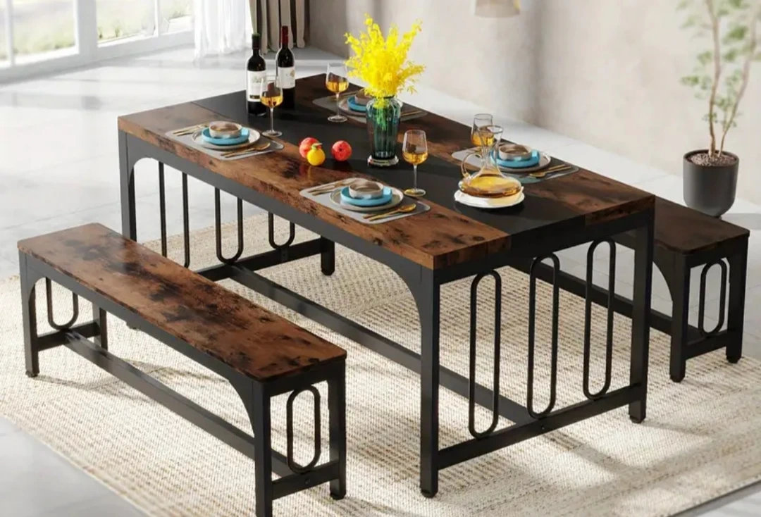 This dining set includes a table and two benches. It's made with a rustic wood finish and black metal frames. The benches tuck neatly under the table when not in use.