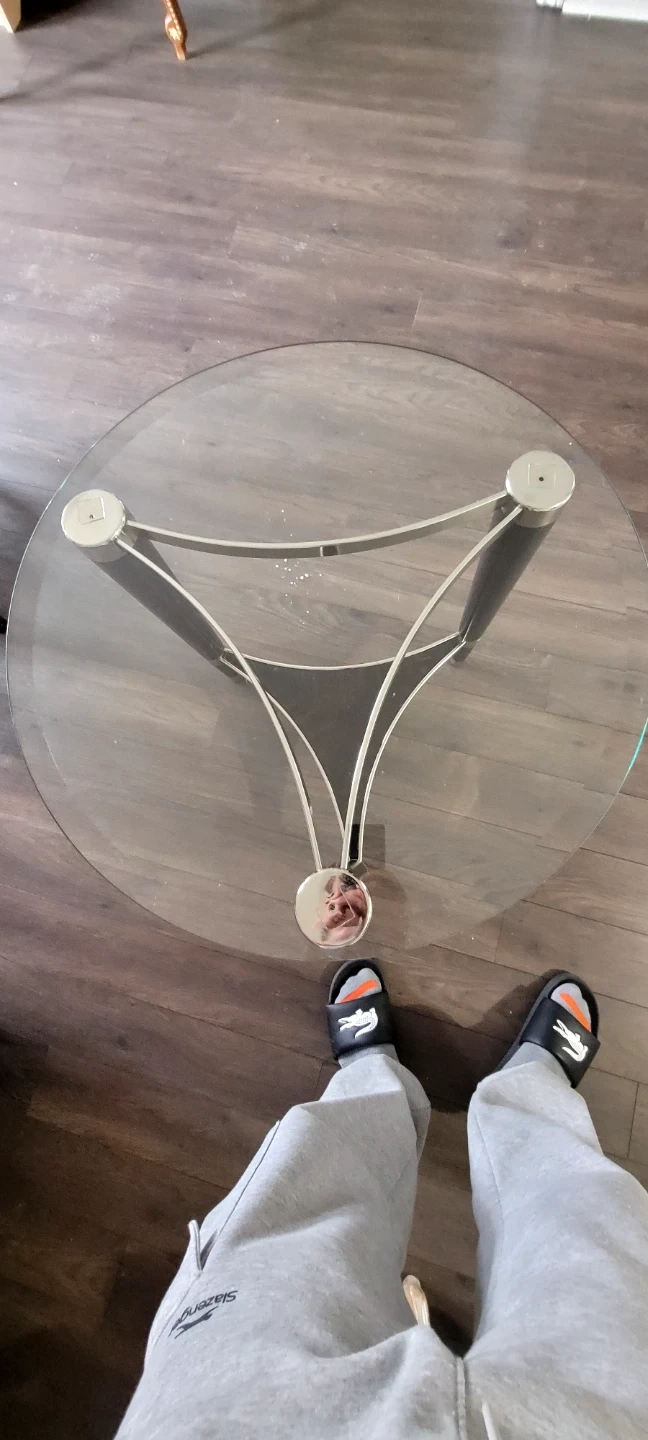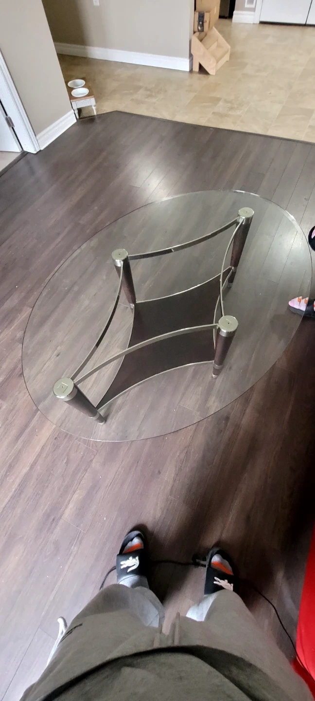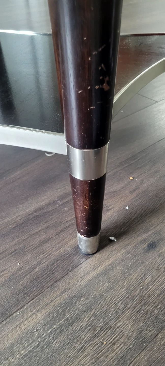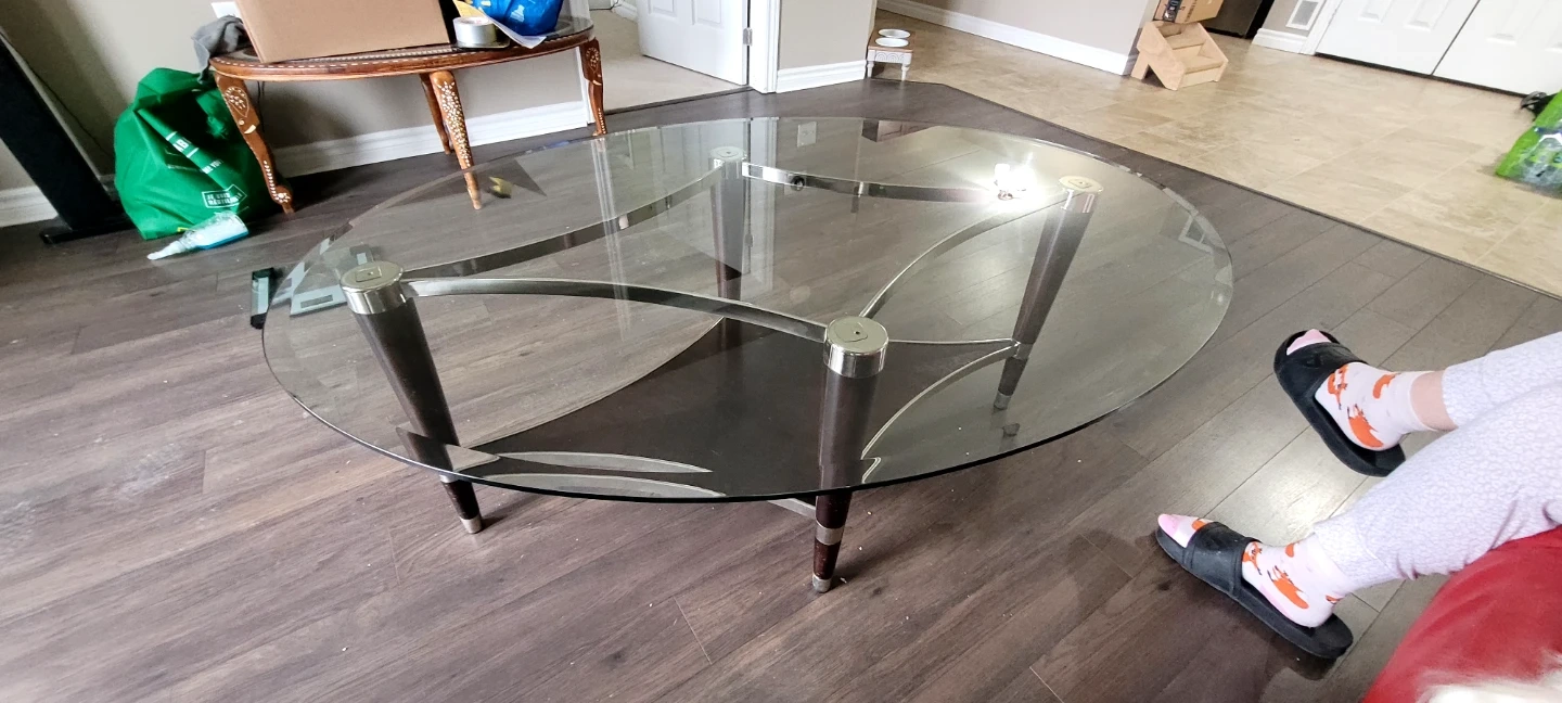 This oval coffee table features a clear glass top with a dark wood and chrome base. It's a stylish piece for your living room! The legs are made of dark wood with chrome accents.