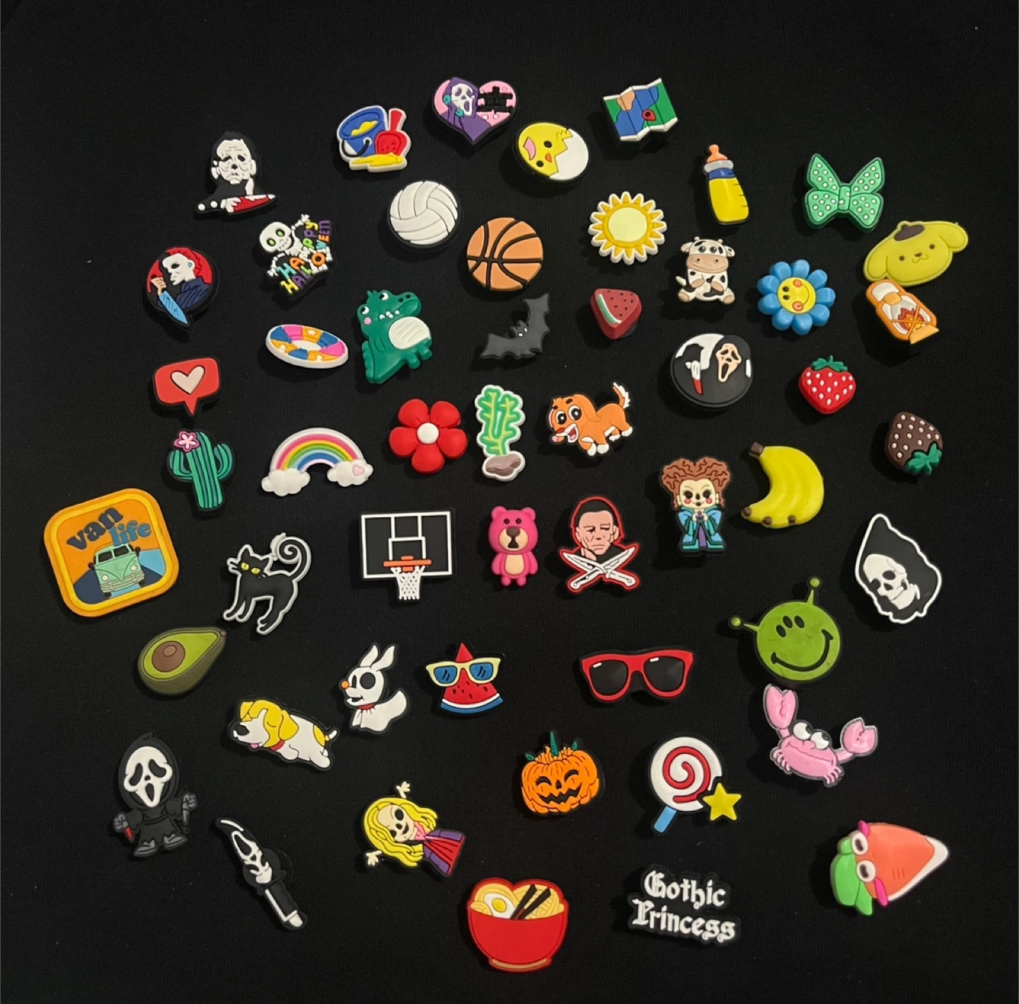 A large collection of assorted Jibbitz charms for Crocs shoes. These charms include a variety of themes like Halloween, pop culture characters, animals, food, letters, sports, and more. Mixed with real croc brand jibbits!