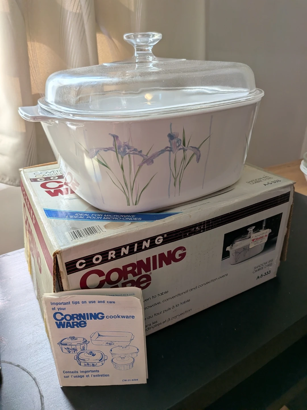 This is a Corning Ware 5L sauce pot with a clear glass lid with an iris floral design on the exterior. It's microwave, conventional oven, and stovetop safe. This dish is perfect for serving your favourite meals straight from the oven to the table! New - just sat in our cupboards (along with two other listed Corning Ware!) over the years.