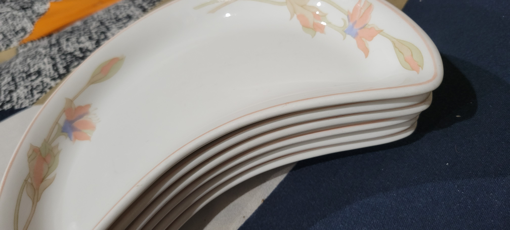 Selling a set of lovely Dudson Fine China plates. These are a unique half-moon shape with a delicate floral design around the edge. Perfect for adding a touch of elegance to your table setting!