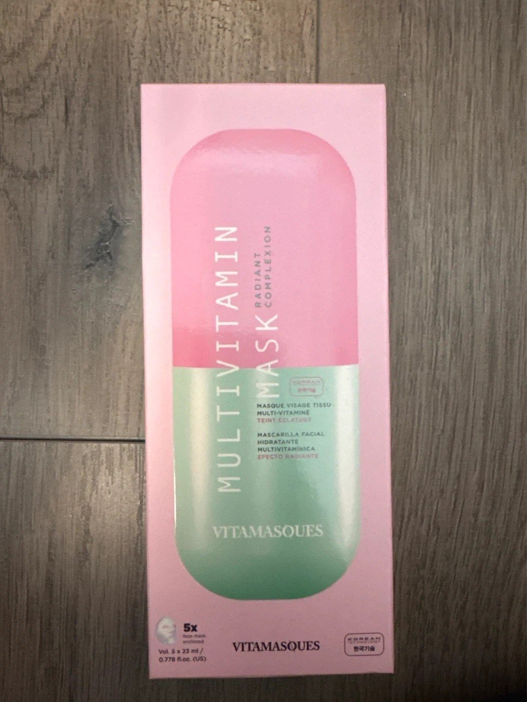 Five Vitamásques Multivitamin face masks are included, each with 23ml of product. They offer a radiant complexion. This is a Korean technology product.