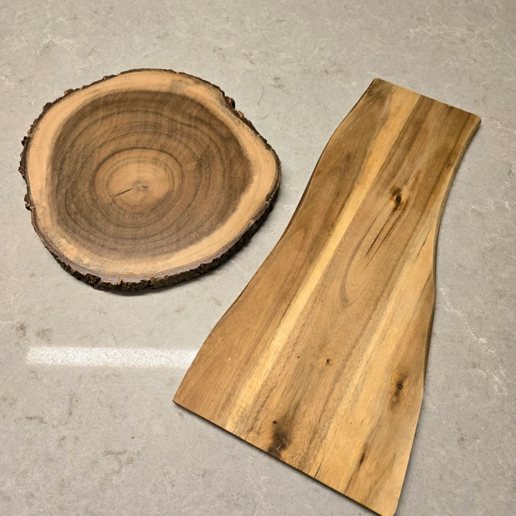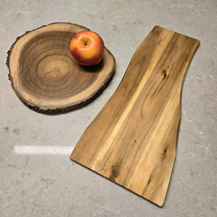Selling a wooden cutting board and a round serving board set. They're in great condition and ready for a new home. Perfect for preparing meals or serving snacks to guests!