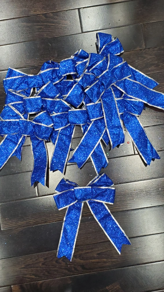 10 bows. See images for approximate sizes. Comes with hooks attached for easy assemble. Bows have built in wire on the ribbons making it easy to shape accordingly