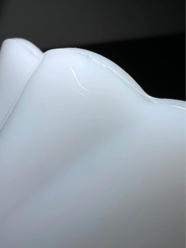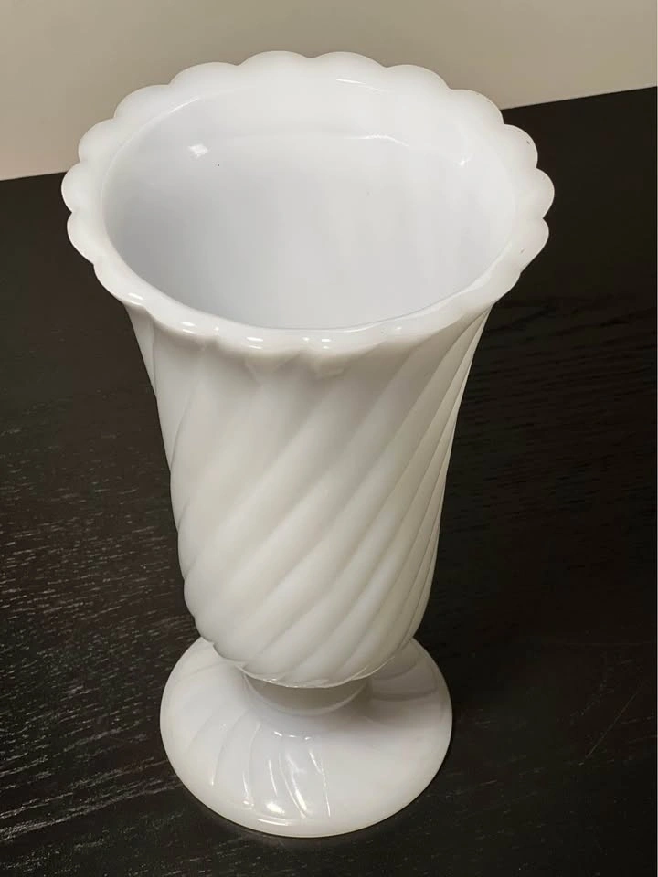 This is a vintage 9-inch milk glass pedestal vase with a distinctive swirl design and a scalloped rim. Made of opaque white milk glass, it features a swirl or ribbed pattern on the body and a flared or ruffled rim with a footed base. Similar vases were popular in the mid-20th century, particularly the 1960s. Pre-owned with small chips as shown in photos. Pickup is 58th and 7th Ave in midtown Manhattan.