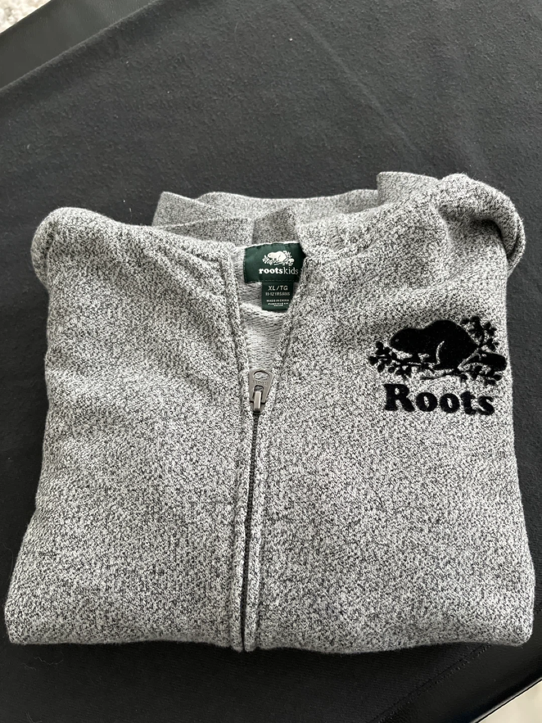 Roots kids grey full zip-up hoodie. Size XL/TG, fits 11-12 years. Made from a soft cotton blend.