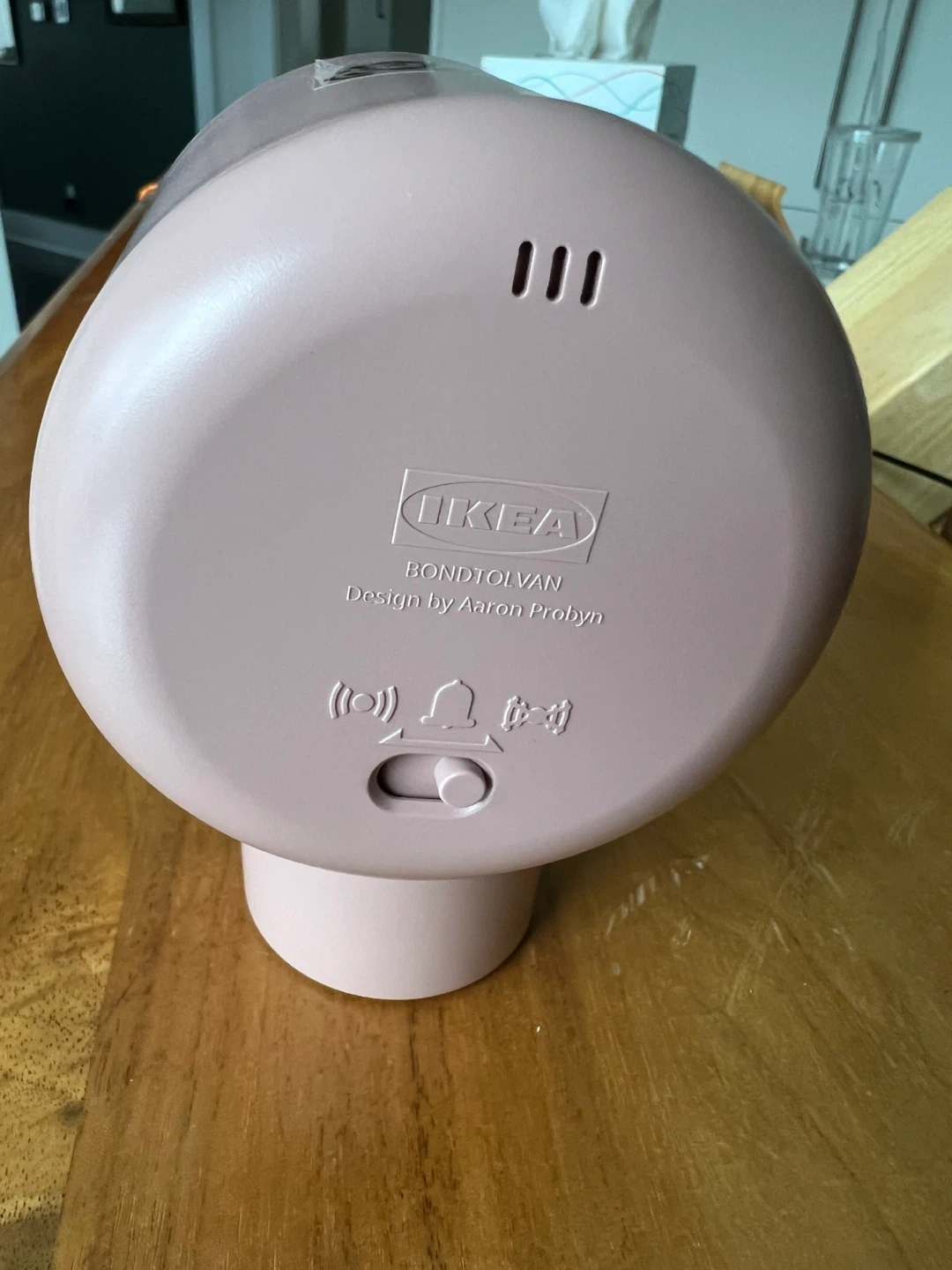 This IKEA BONDTOLVAN alarm clock is designed by Aaron Probyn. It's a pink clock with an alarm function. Height is 12 cm (4 ¾ "). Width is 8.5 cm (3 ¼ "). Depth is 9 cm (3 ½ "). Diameter is 8 cm (3 ¼ ").