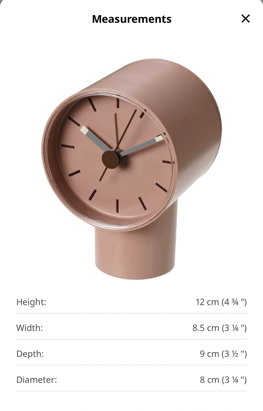 This IKEA BONDTOLVAN alarm clock is designed by Aaron Probyn. It's a pink clock with an alarm function. Height is 12 cm (4 ¾ "). Width is 8.5 cm (3 ¼ "). Depth is 9 cm (3 ½ "). Diameter is 8 cm (3 ¼ ").