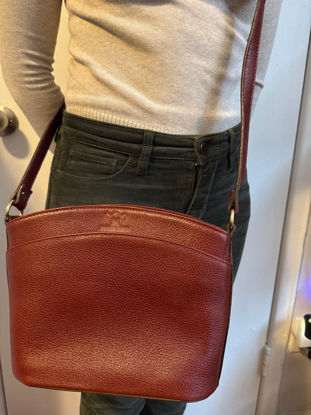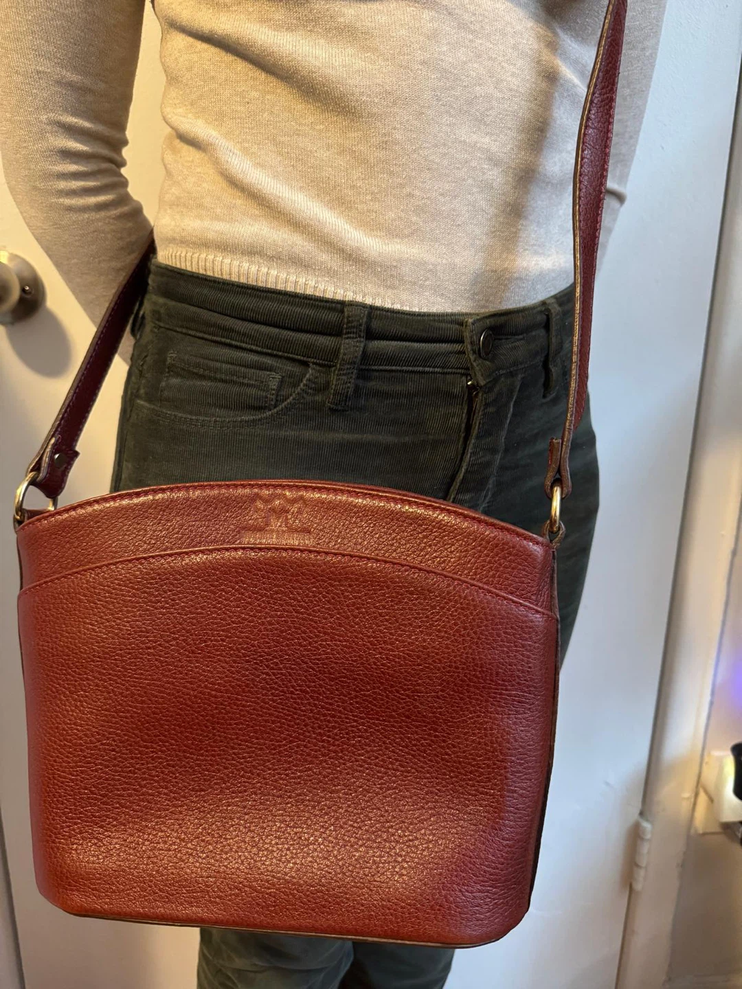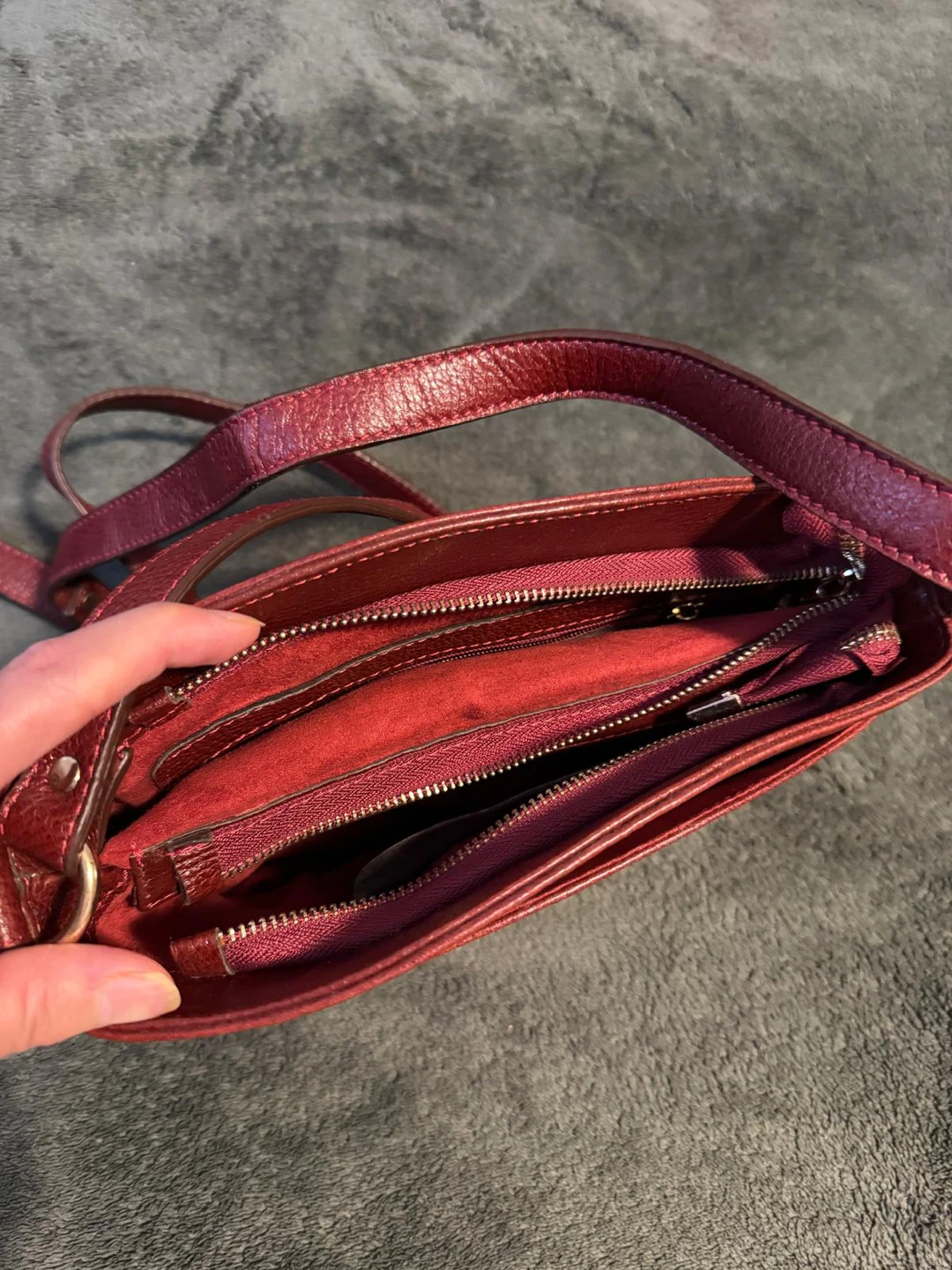Selling a stylish red real genuine leather crossbody bag. It's in great condition and perfect for everyday use! The colour is a beautiful deep red. It has different pockets to keep your stuff organized. Very high quality