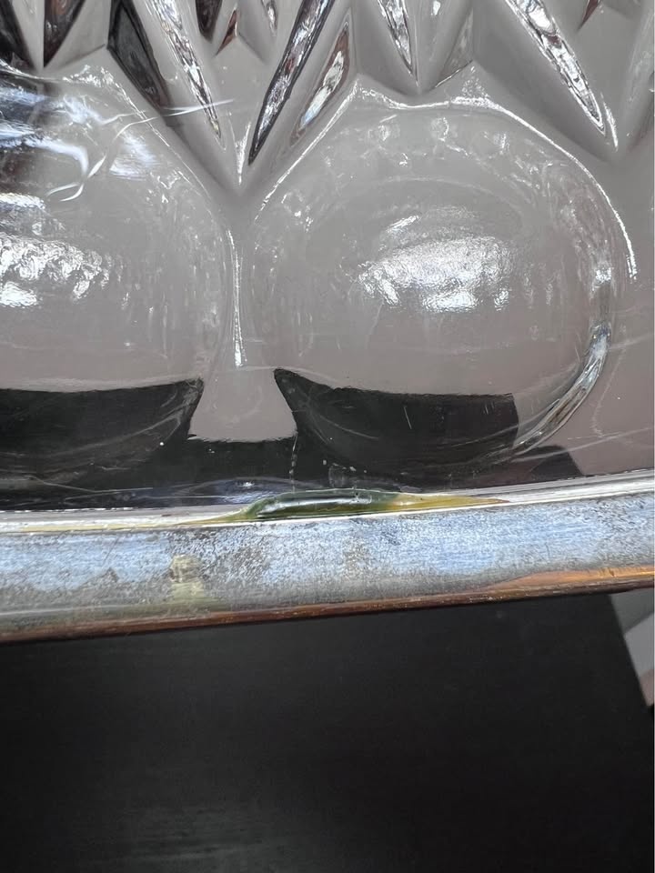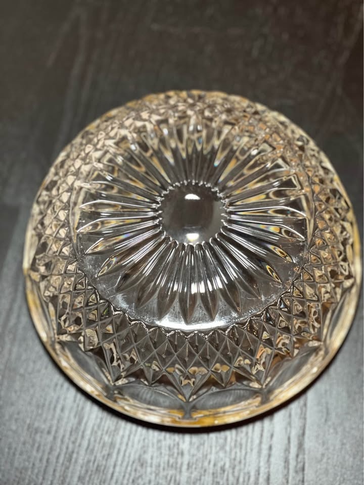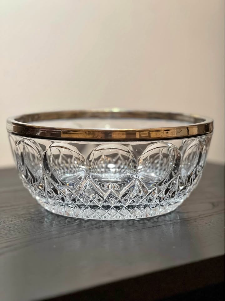 This charming vintage glass bowl features a beautifully cut pattern with a radiant starburst base and a silver-plated rim. The combination of gleaming glass and silver trim creates a timeless, sophisticated look—perfect for both everyday use and special occasions.