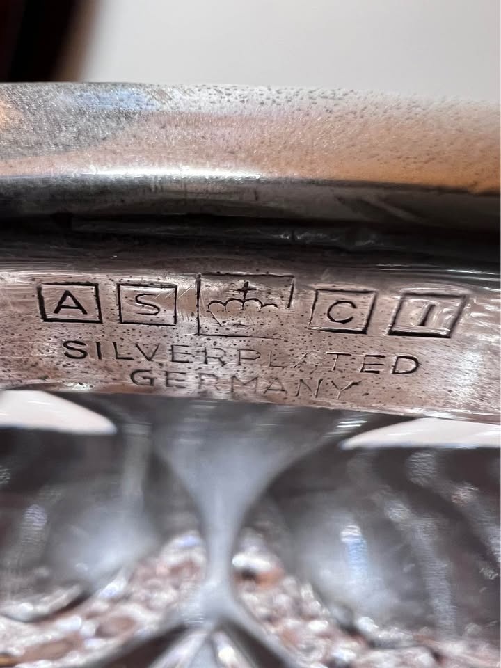This bowl is in vintage condition. The silver-plated rim shows some wear and patina consistent with age, which adds to its authentic vintage charm. See photos.