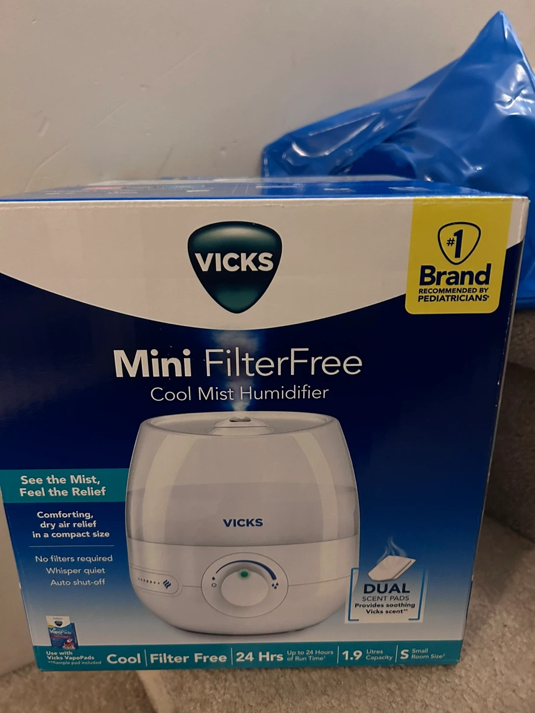This Vicks Mini FilterFree humidifier offers comforting, dry air relief in a compact size. It's filter-free, whisper quiet, and has an auto shut-off feature. The unit has a 1.9 Litre capacity and provides up to 24 hours of run time.