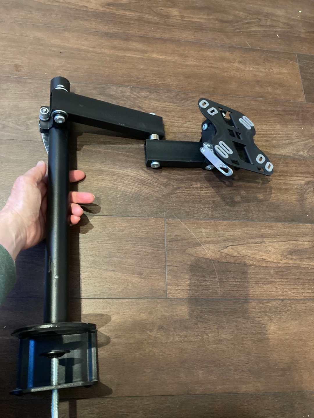 Monitor arm, height adjustable and rotatable. Has a black finish. Includes a base clamp and mounting plate. You can easily mount your monitor for your ergonomic needs and to give your desk a more organized and calming feel. Works great!