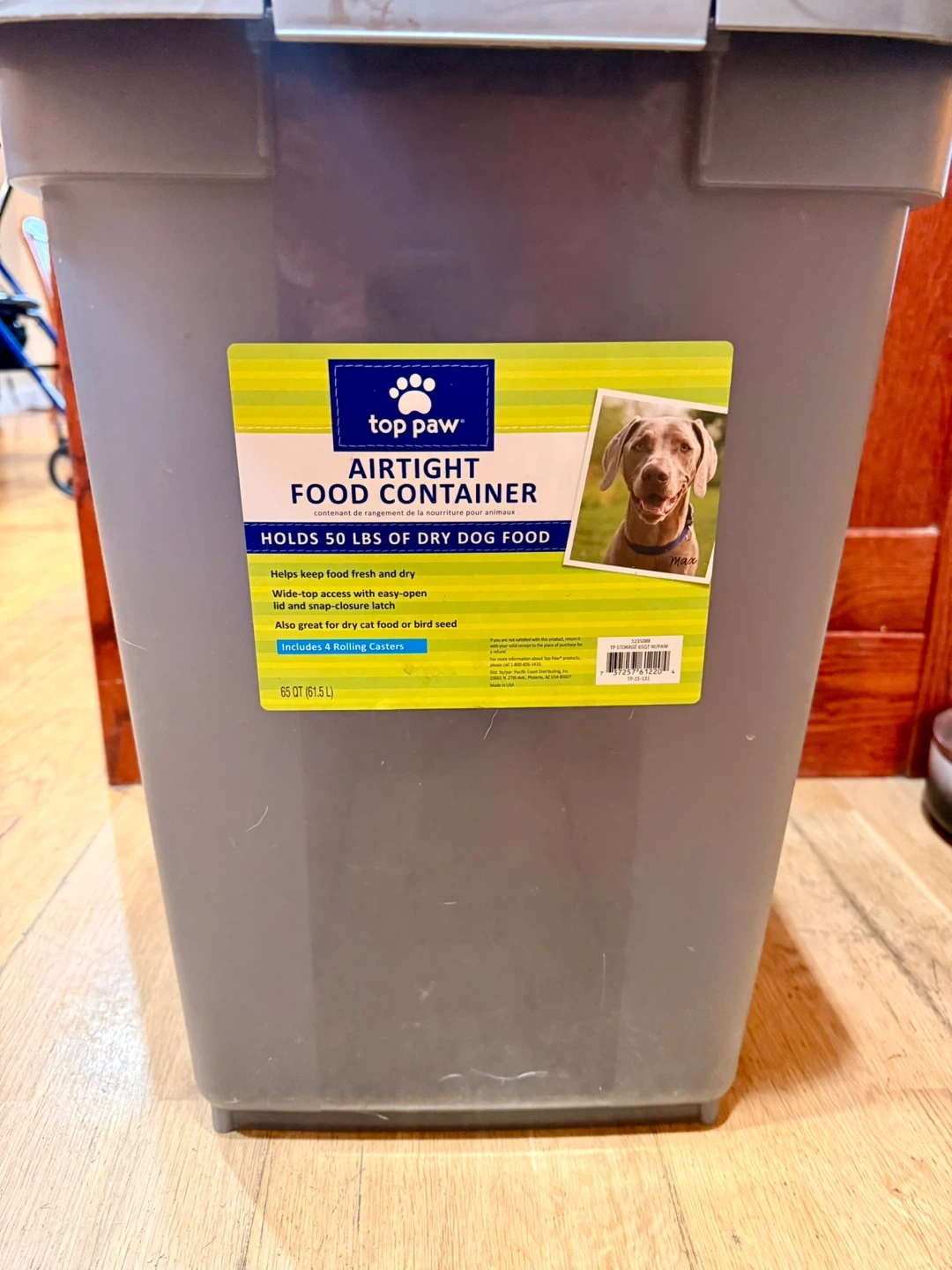 Top Paw airtight food container holds 50 lbs of dry dog food. It keeps food fresh and dry with a wide-top access and easy-open, snap-closure latch. This container also includes 4 rolling casters.