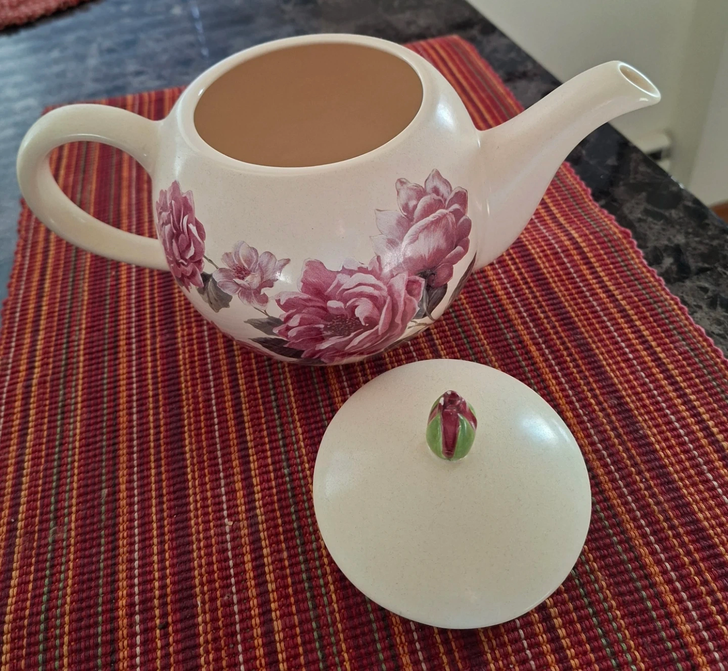 Cream-coloured teapot with a floral design featuring pink roses and a green bud on the lid. Ceramic material. A lovely piece and still can be used for making tea.