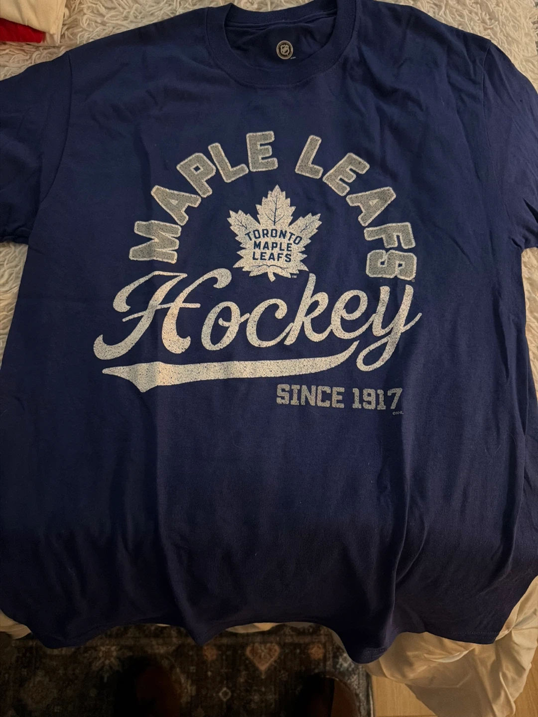 This is a Toronto Maple Leafs hockey t-shirt. It's navy blue with "Maple Leafs Hockey Since 1917" graphics. Show your team spirit! Size Medium