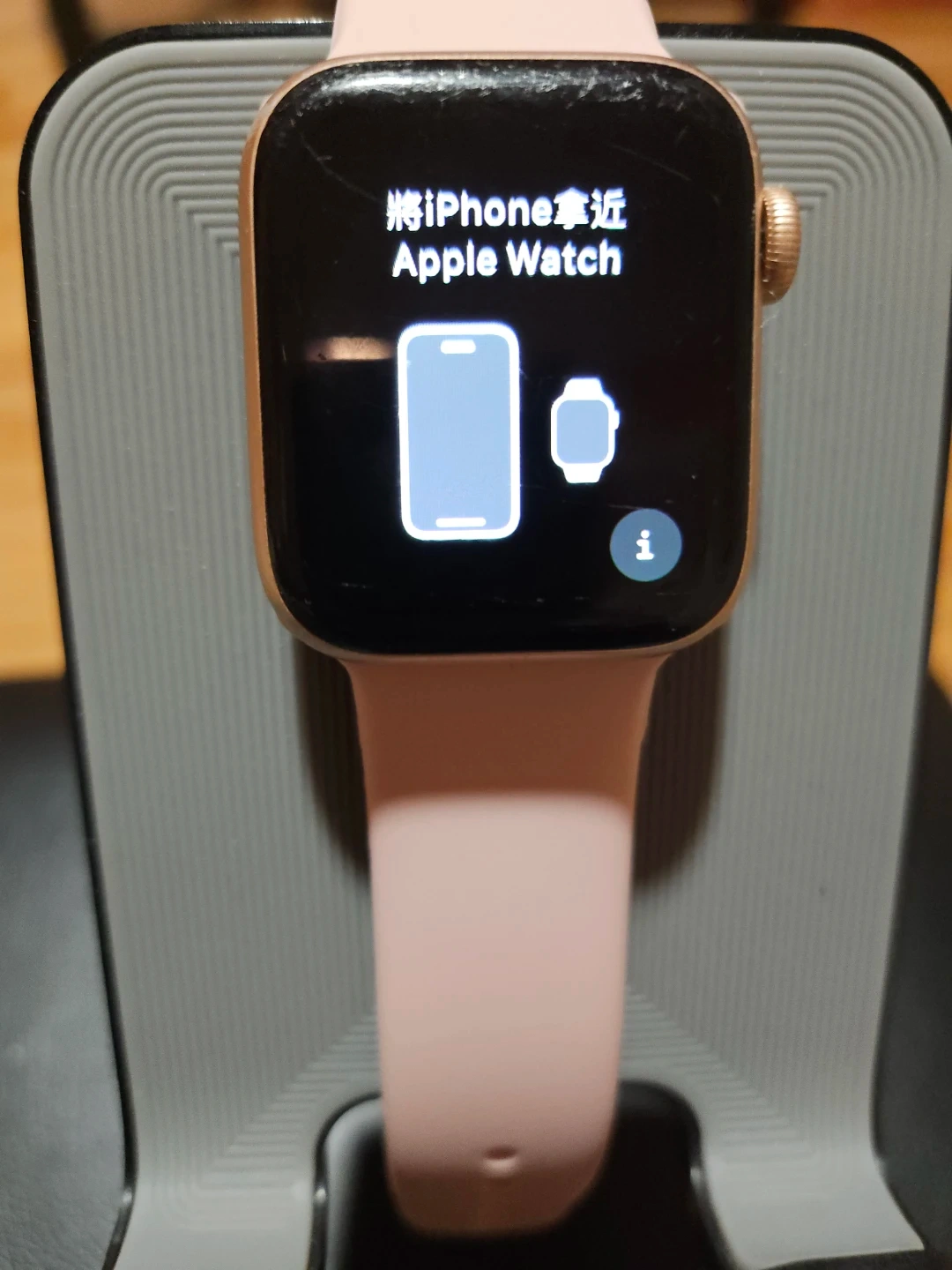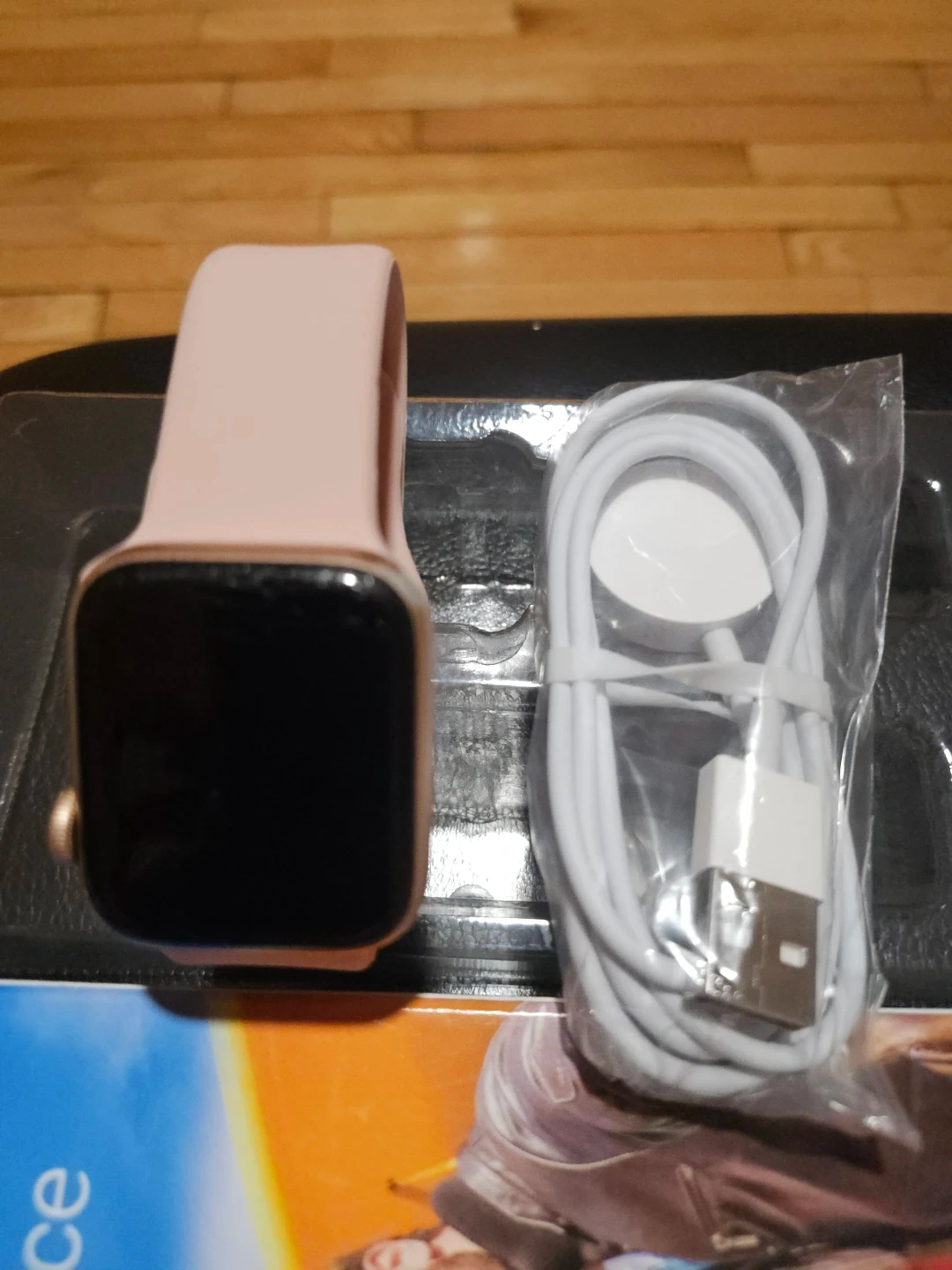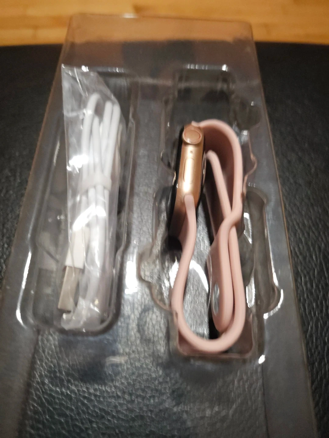 This pink Apple.watch comes with a USB charging cable. It has a rose gold casing and a pink silicone band. The screen is black.