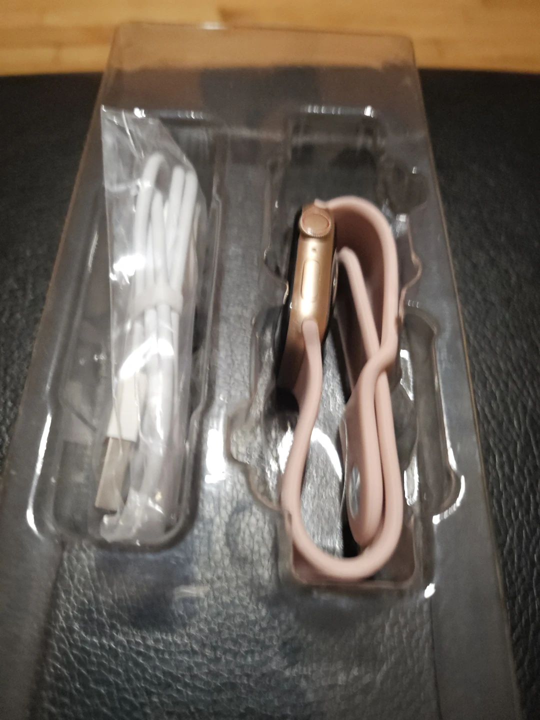 This pink Apple.watch comes with a USB charging cable. It has a rose gold casing and a pink silicone band. The screen is black.