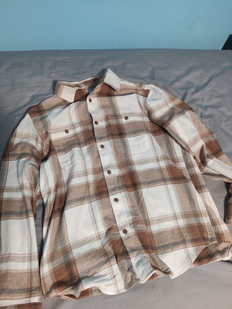 Cozy Old Navy flannel shirt in a brown and white plaid pattern! It's a size M and features a double-brushed texture for extra softness