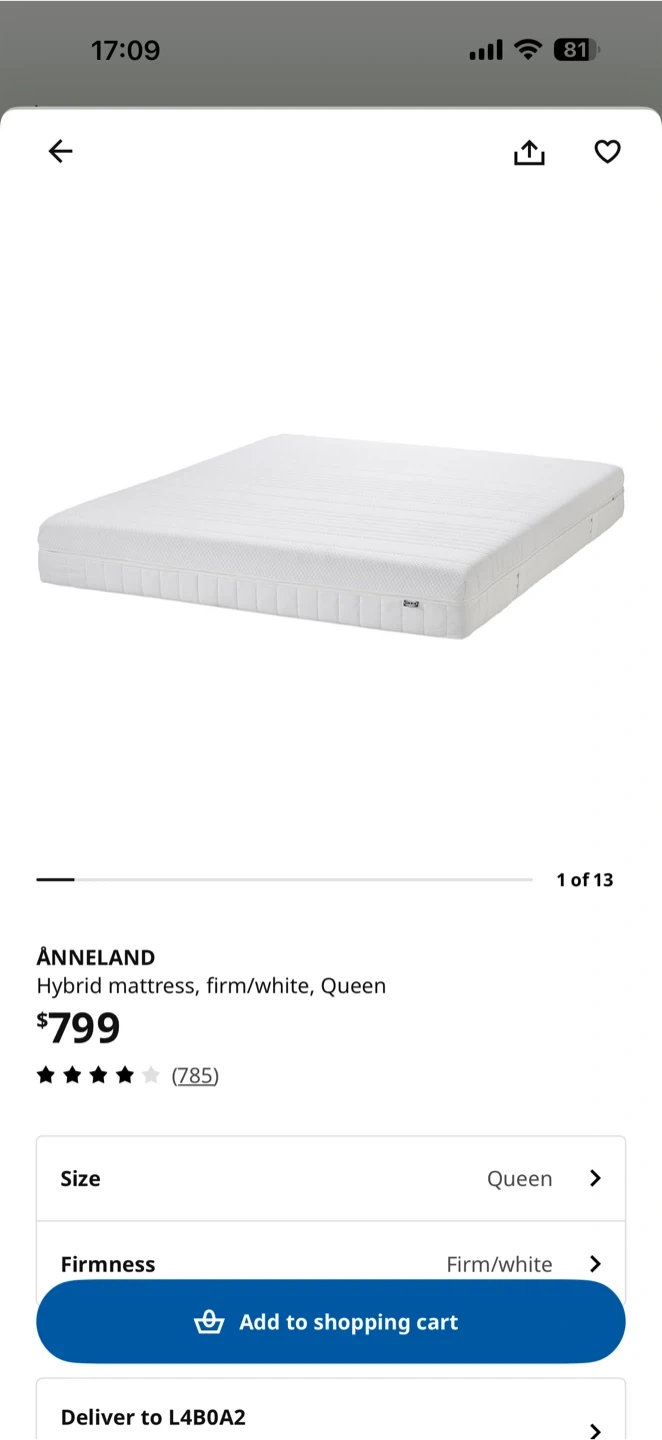 Buy & SellIKEA ANNELAND Queen Hybrid MattressIKEA ANNELAND Queen Hybrid Mattress$200This is an IKEA ANNELAND Queen hybrid mattress in white. It's a firm mattress. Like new conditionConditionLike newWHERE TO MEETCheck LocationView MapSELLERBekkoLangstaff221 review0 chats·0 favorites·18 viewsSEND CHAT TO SELLERHi Bekko! I’m interested in your listing.Hi Bekko! I’m interested in your listing.Get the Karrot app to chatSign In to chat
