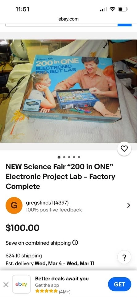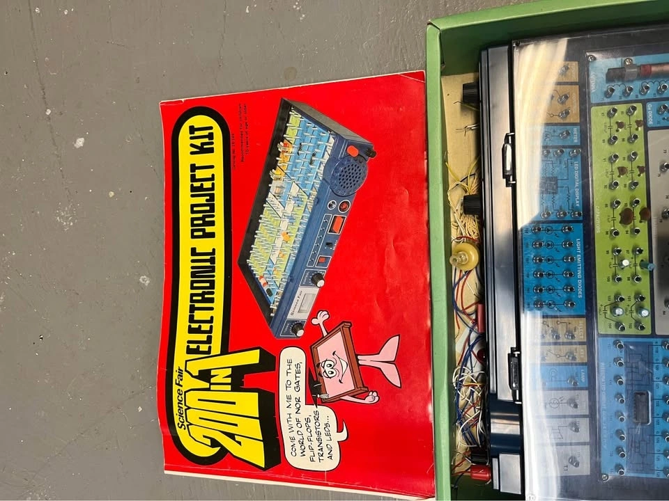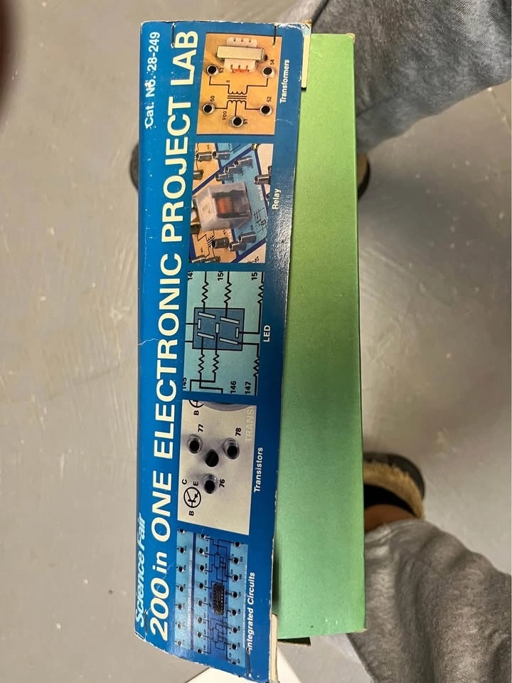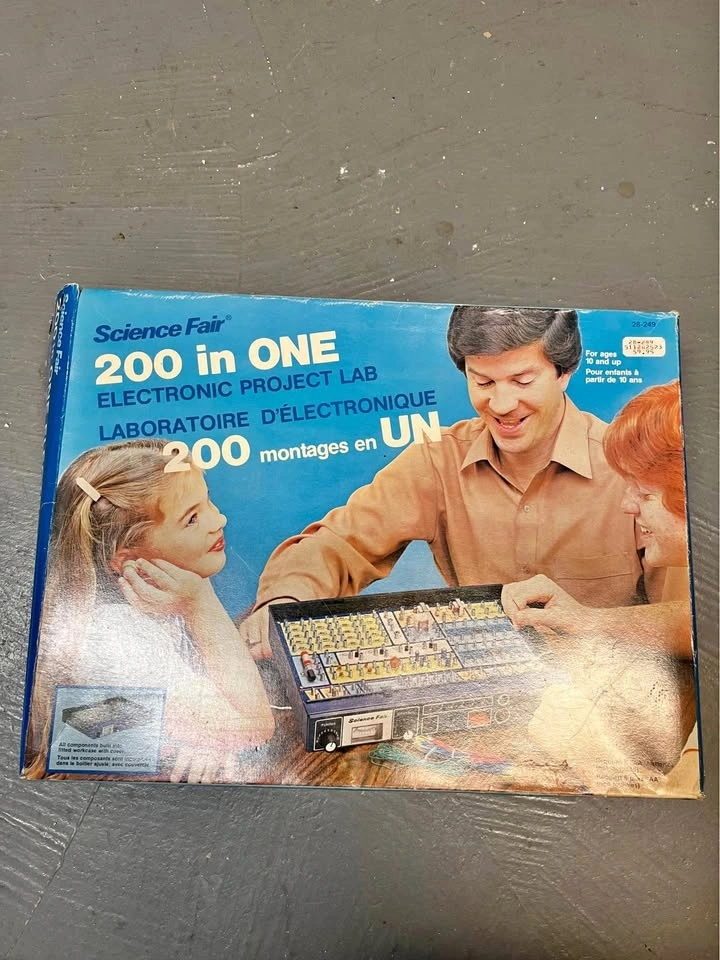 This is a vintage Radio Shack Science Fair 200 in One Electronic Project Lab (Cat No. 28-249). It's a hands-on learning tool for ages 10 and up to construct various electronic circuits. It features a built-in work case with a cover and original wiring components. Requires 6 AA batteries (not included). Includes the original project manual from the 1980s. No pieces missing.