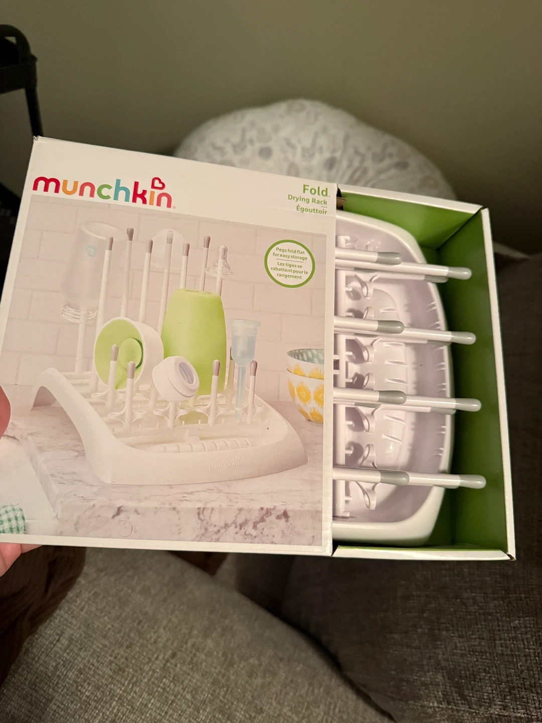 Brand new Munchkin Fold Drying Rack is perfect for drying baby bottles and accessories. The pegs fold flat for easy storage. It's a handy item for any kitchen counter.