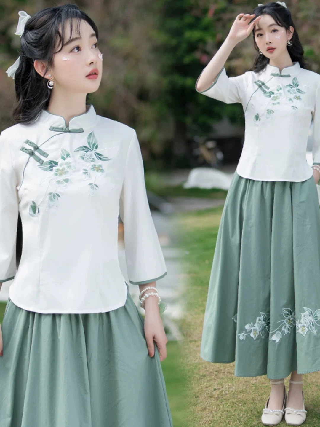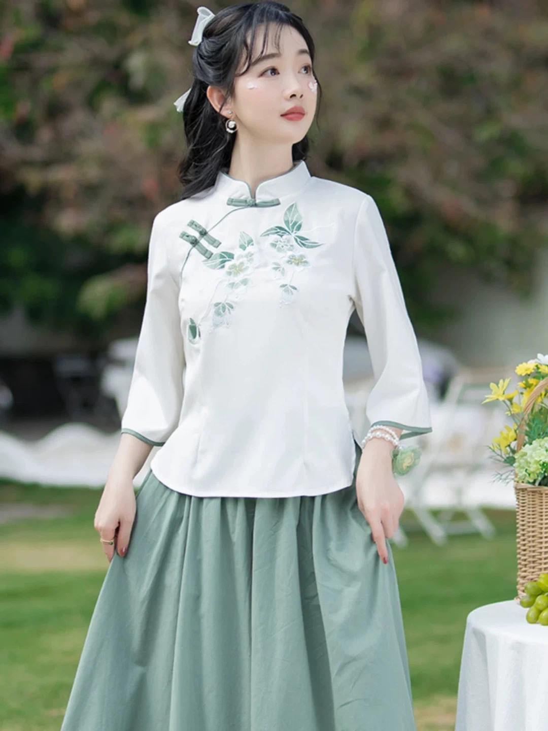 • Top: Adopts a classic stand-up collar with an asymmetric frog button placket; the frog buttons are in a matching grey-green hue that echoes the floral embroidery on the body. It has seven-quarter sleeves with contrast color binding at the cuffs, and the delicate embroidery pattern of green leaves and white flowers exudes an elegant and fresh vibe.