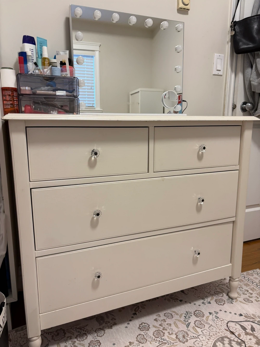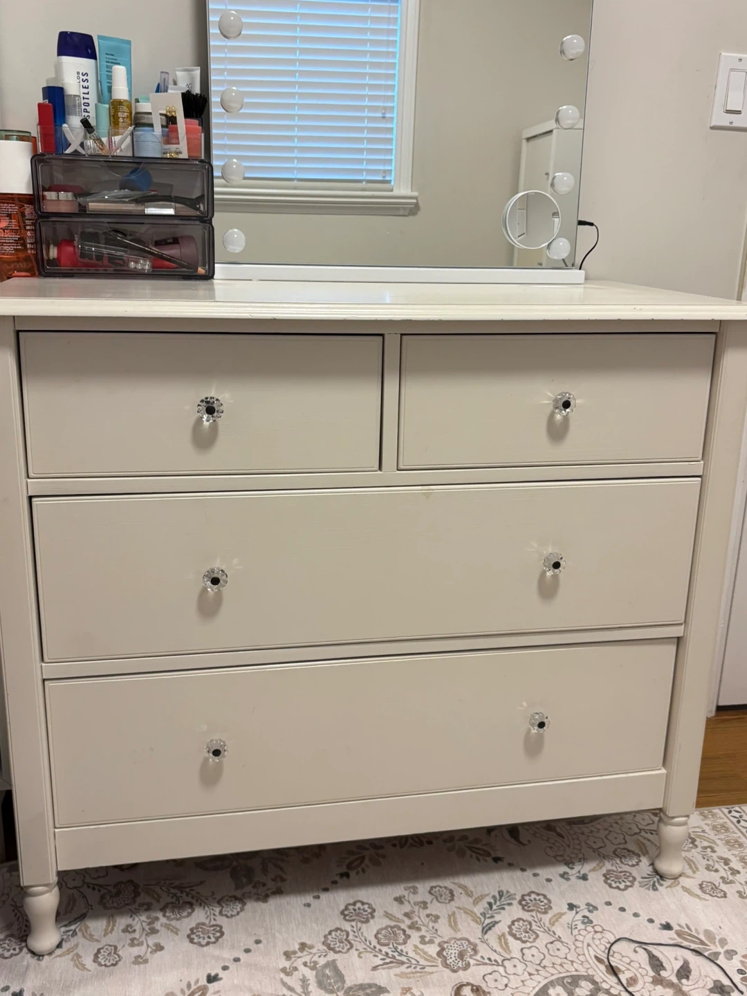 This is a white, four-drawer dresser from Pottery Barn Kids. It has decorative crystal knobs. Dimensions are 39" wide x 19" deep x 34" high.