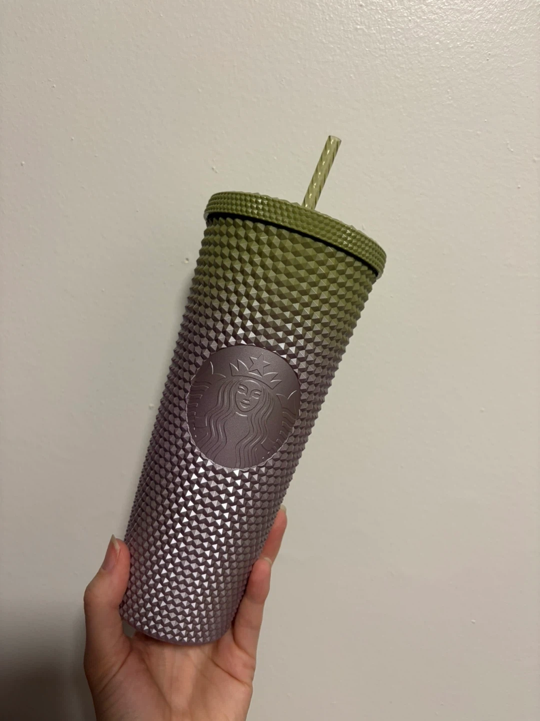 Selling a Starbucks studded tumbler with a cool gradient from olive green to lilac! It's in great shape and ready for your favourite iced drinks!