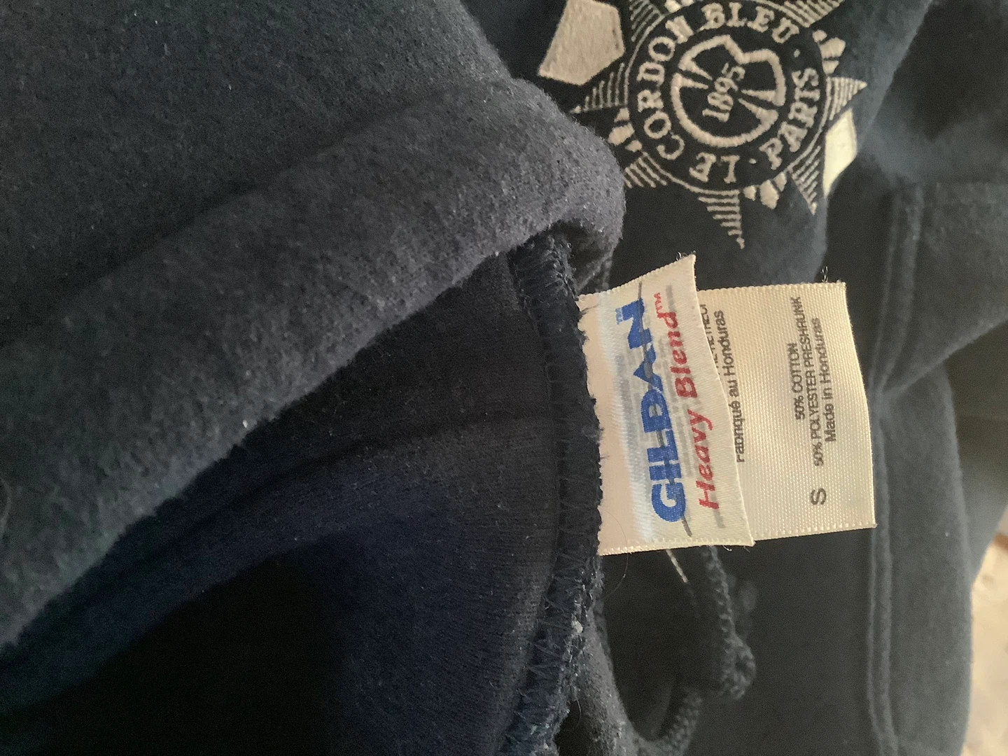 Navy blue Gildan Heavy Blend hoodie with Cordon Bleu Paris logo. It's a size small. Made of 50% cotton and 50% polyester.