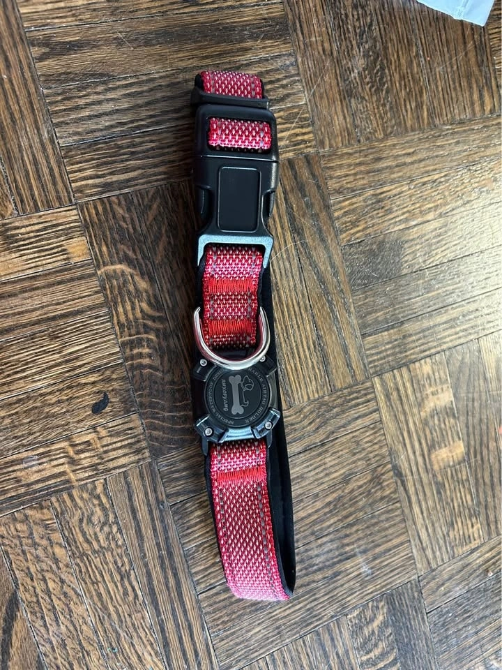 Upgraded AirTag dog collar – brand new. Fits Large dogs (14.8"–20.3"). Built-in AirTag holder (IP68 waterproof). Reflective for night visibility. Ultra-durable & padded for comfort. Heavy duty design. Colour: Red.