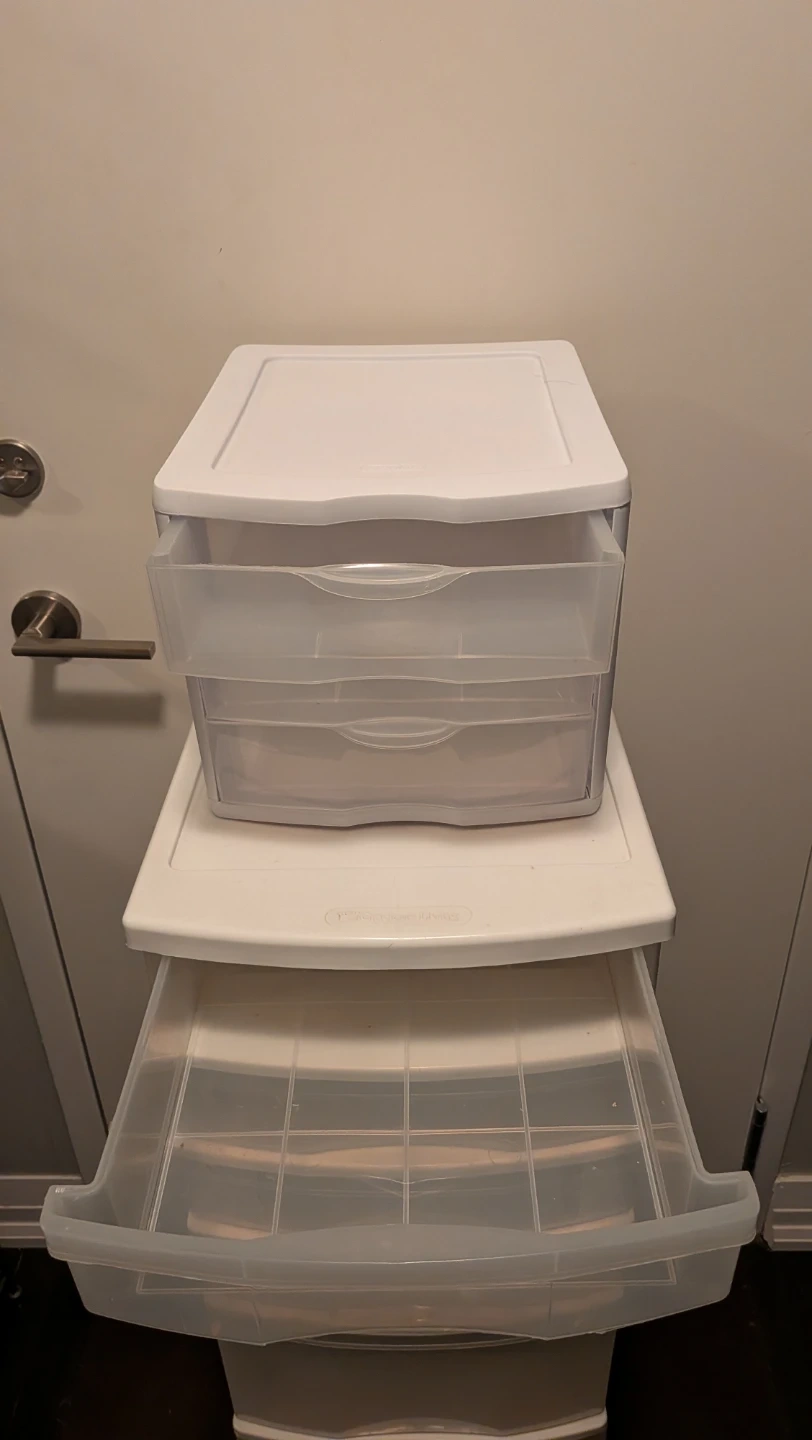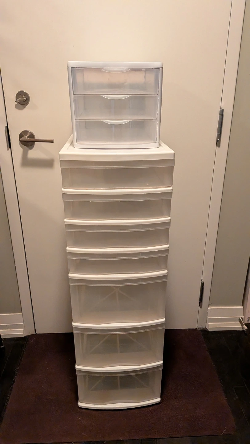 White plastic drawer unit organizer with multiple drawers. Includes a smaller top unit with 3 drawers and a larger base unit with 7 drawers. Great for storing craft supplies or small items!