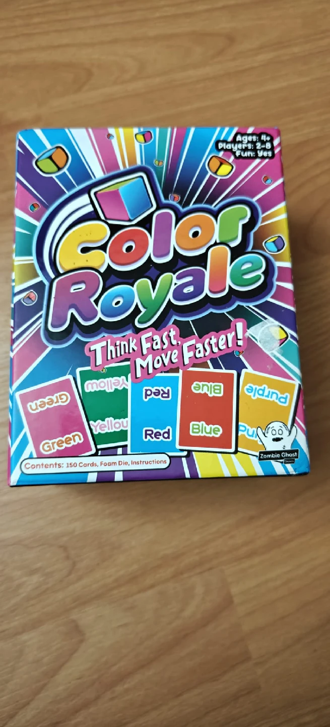 Selling the Color Royale board game! It's a fast-paced game designed to test your speed and reflexes. The game includes 150 cards, a foam die, and instructions. It's for ages 6+ and for 2-6 players. Think fast, move faster!