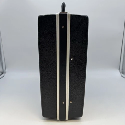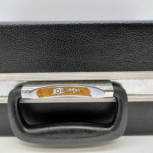 This is a vintage Dionite hard-shell carrying case in very good condition. It features a textured black exterior, chrome trim, and a sturdy handle. The case opens and closes smoothly, the hinges are strong, and the exterior is clean with only light signs of use. The interior is empty and ready for storage, transport, organization, or repurposing for tools, equipment, documents, or collectibles.
