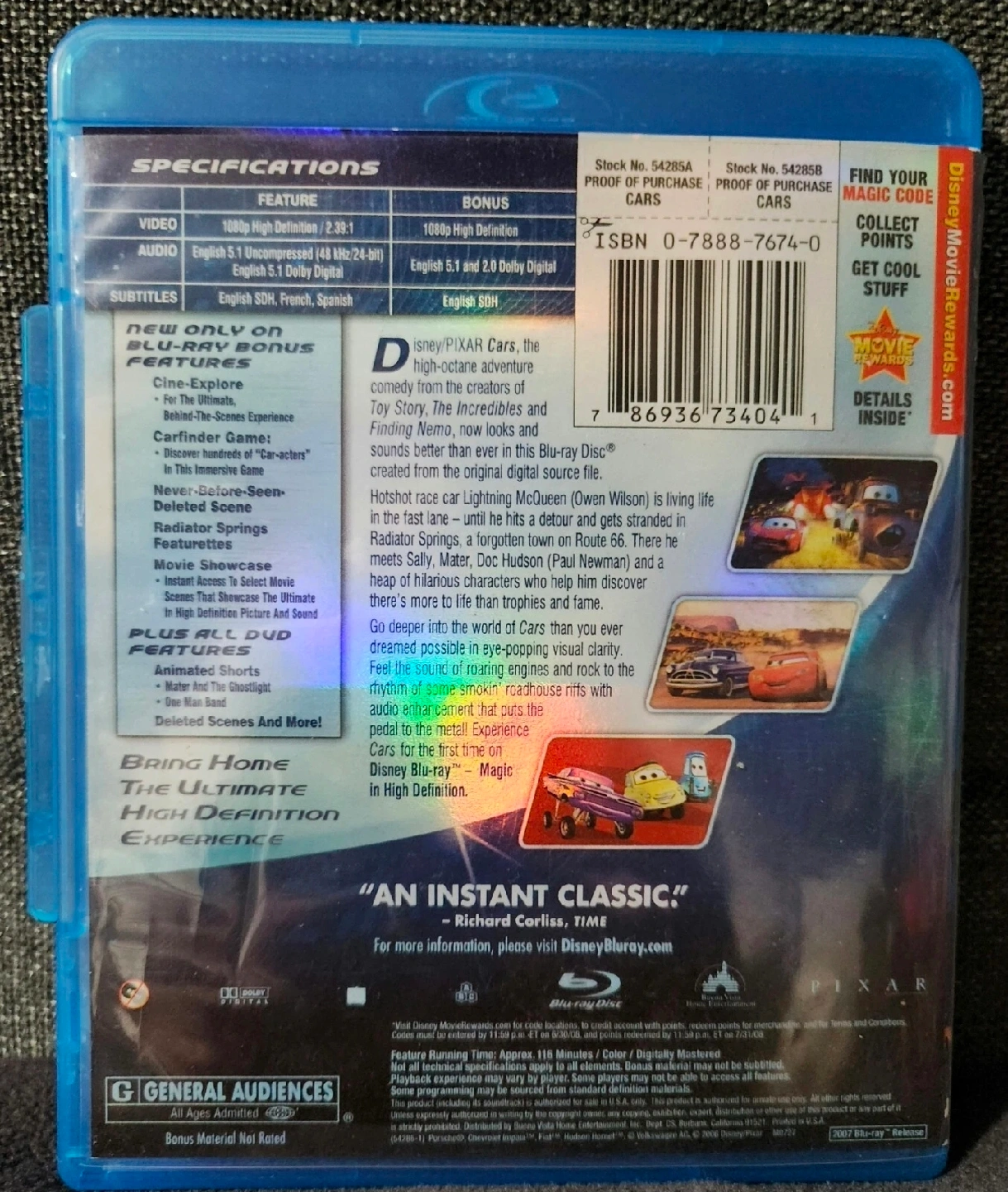 For sale is a Disney Pixar Cars Blu-ray Disc. This movie is perfect for children and families who enjoy animated films. It comes in a Blu-ray case and is compatible with Blu-ray players in any region. The movie was released in 2007 and features the voices of talented actors and actresses. The video format is Blu-ray and has a G rating, making it appropriate for all ages.