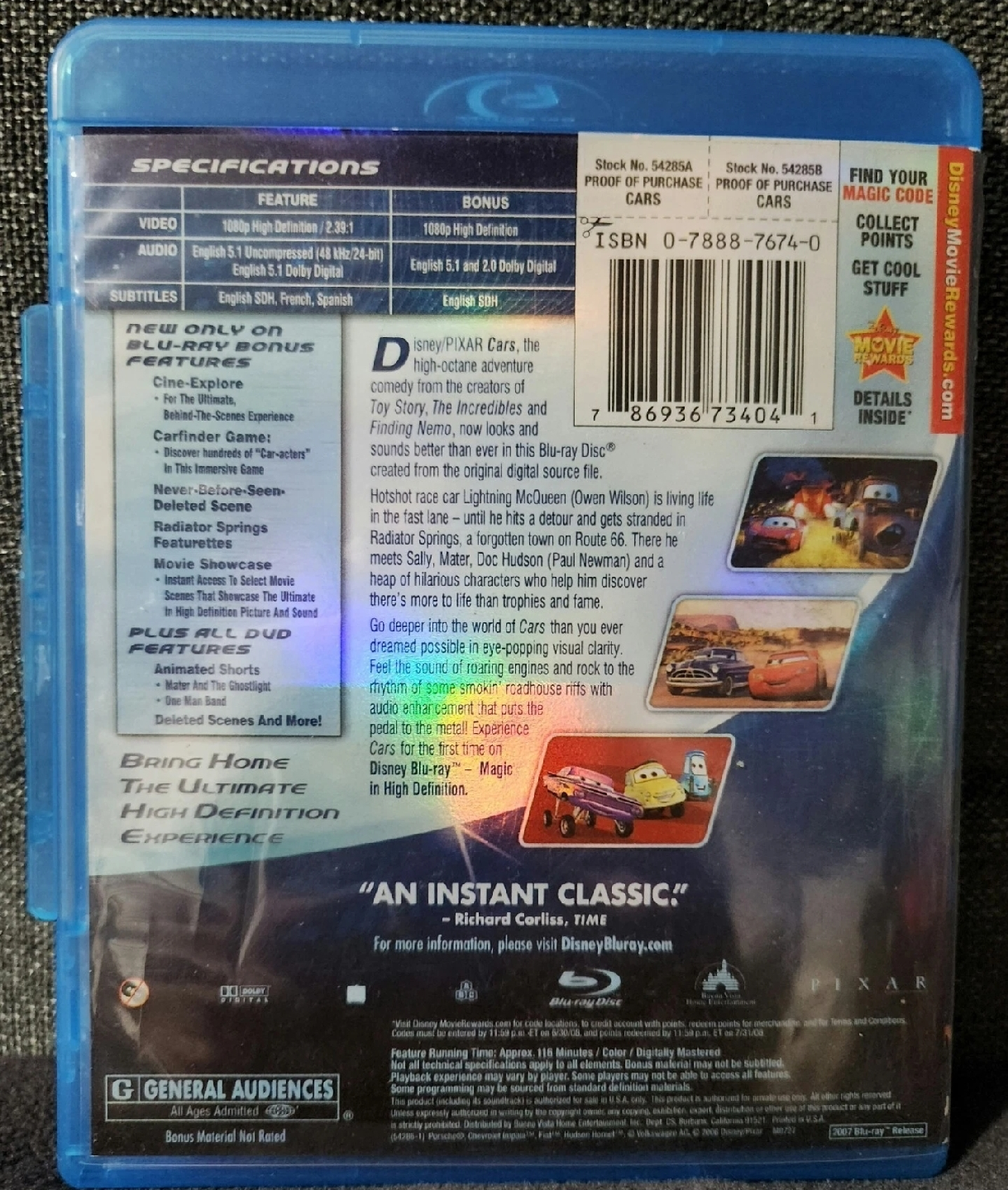 For sale is a Disney Pixar Cars Blu-ray Disc. This movie is perfect for children and families who enjoy animated films. It comes in a Blu-ray case and is compatible with Blu-ray players in any region. The movie was released in 2007 and features the voices of talented actors and actresses. The video format is Blu-ray and has a G rating, making it appropriate for all ages.